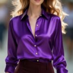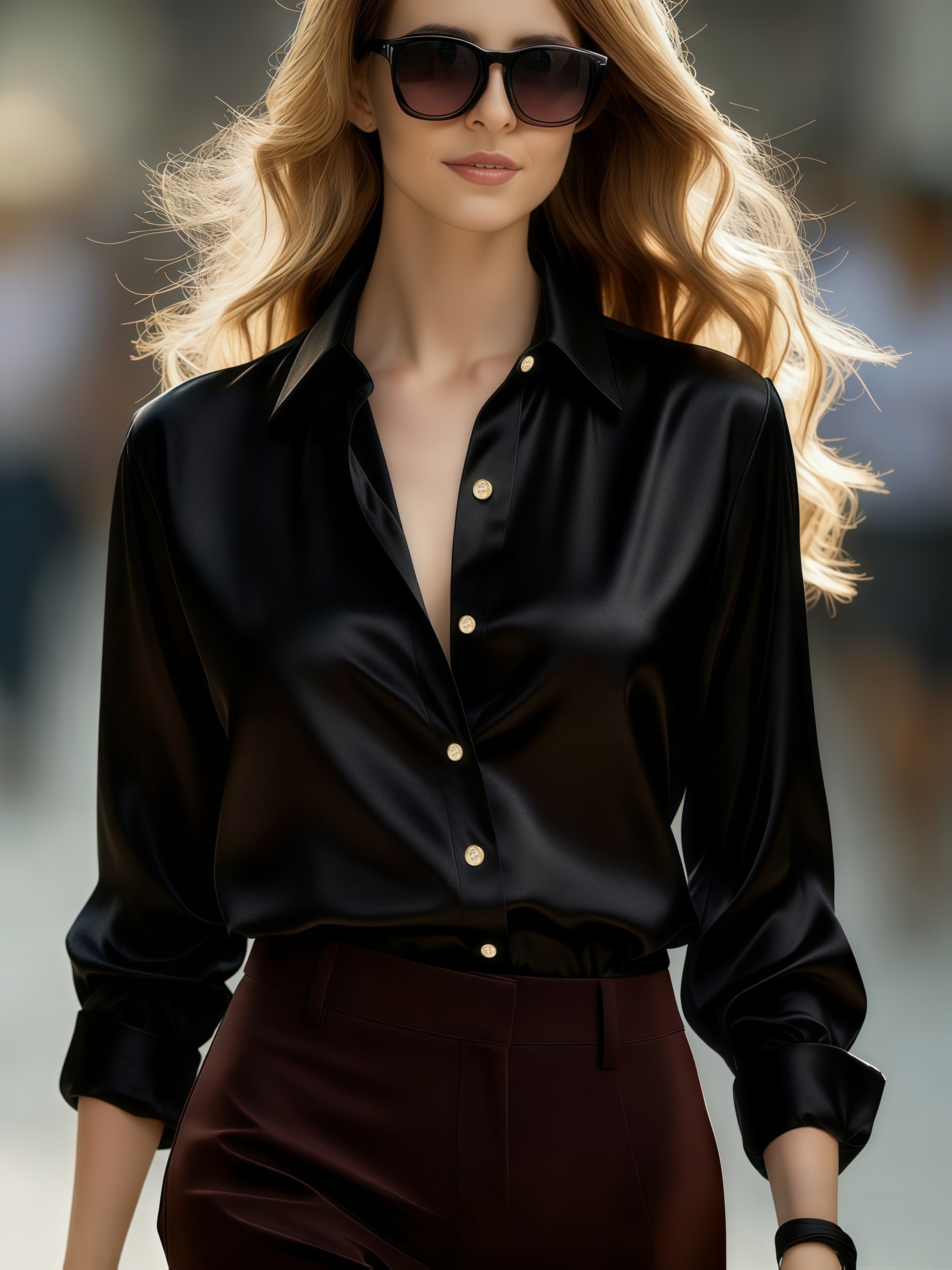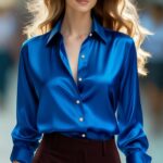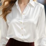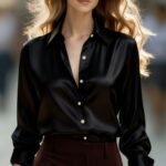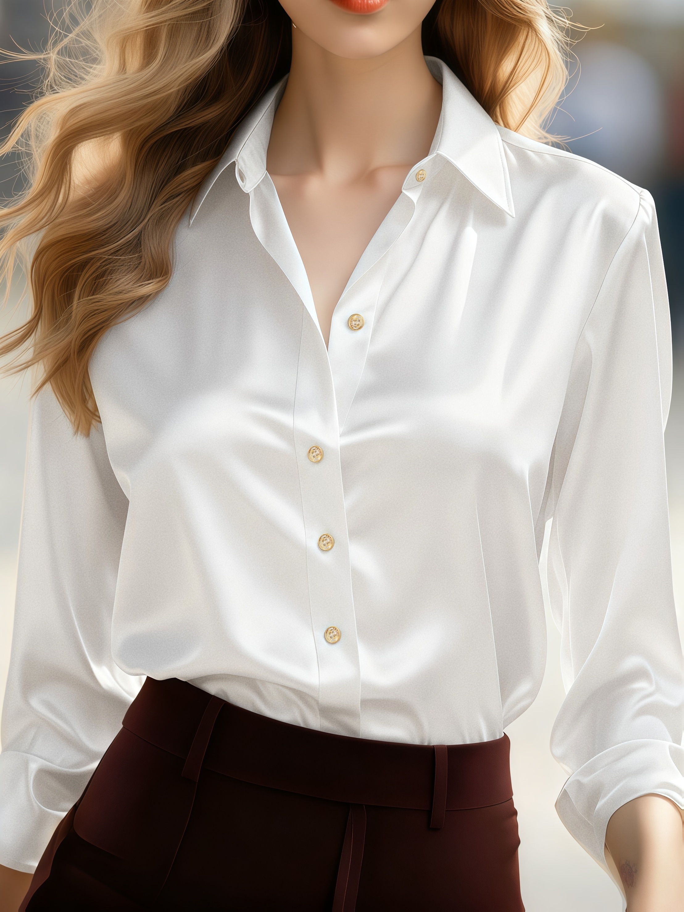 Sé el primero en valorar “Camisa de Mujer de Manga Larga en Color Sólido, Cuello Giratorio con Botones Delanteros, Tejido de Satén Brillante, Botones con Patrón Dorado” Cancelar respuesta