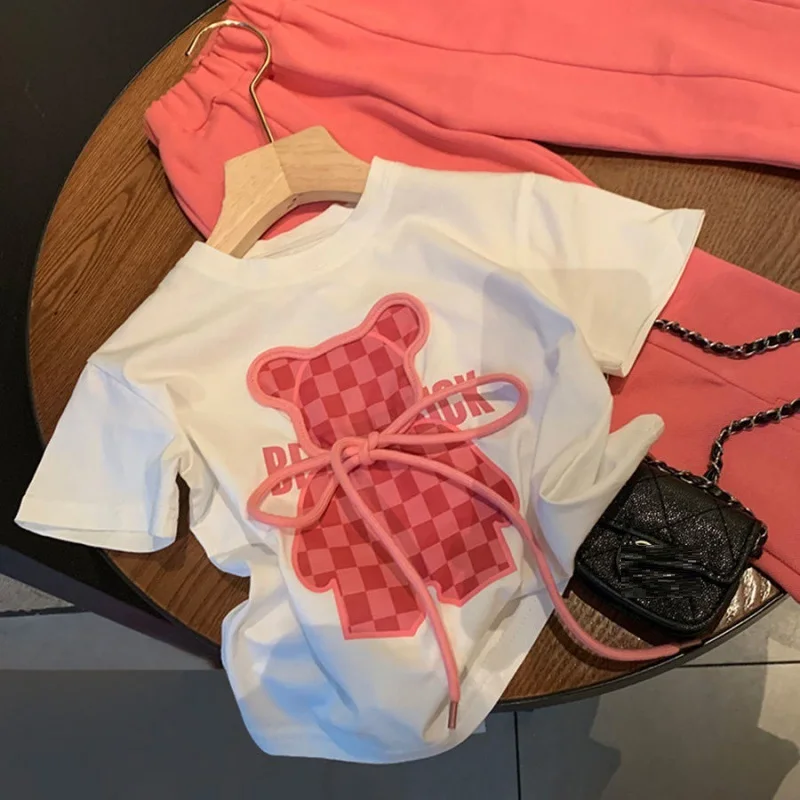 Conjunto de ropa de verano para niñas pequeñas, camiseta de oso de dibujos animados y pantalones acampanados, traje para niños, chándal de manga corta con parte superior inferior