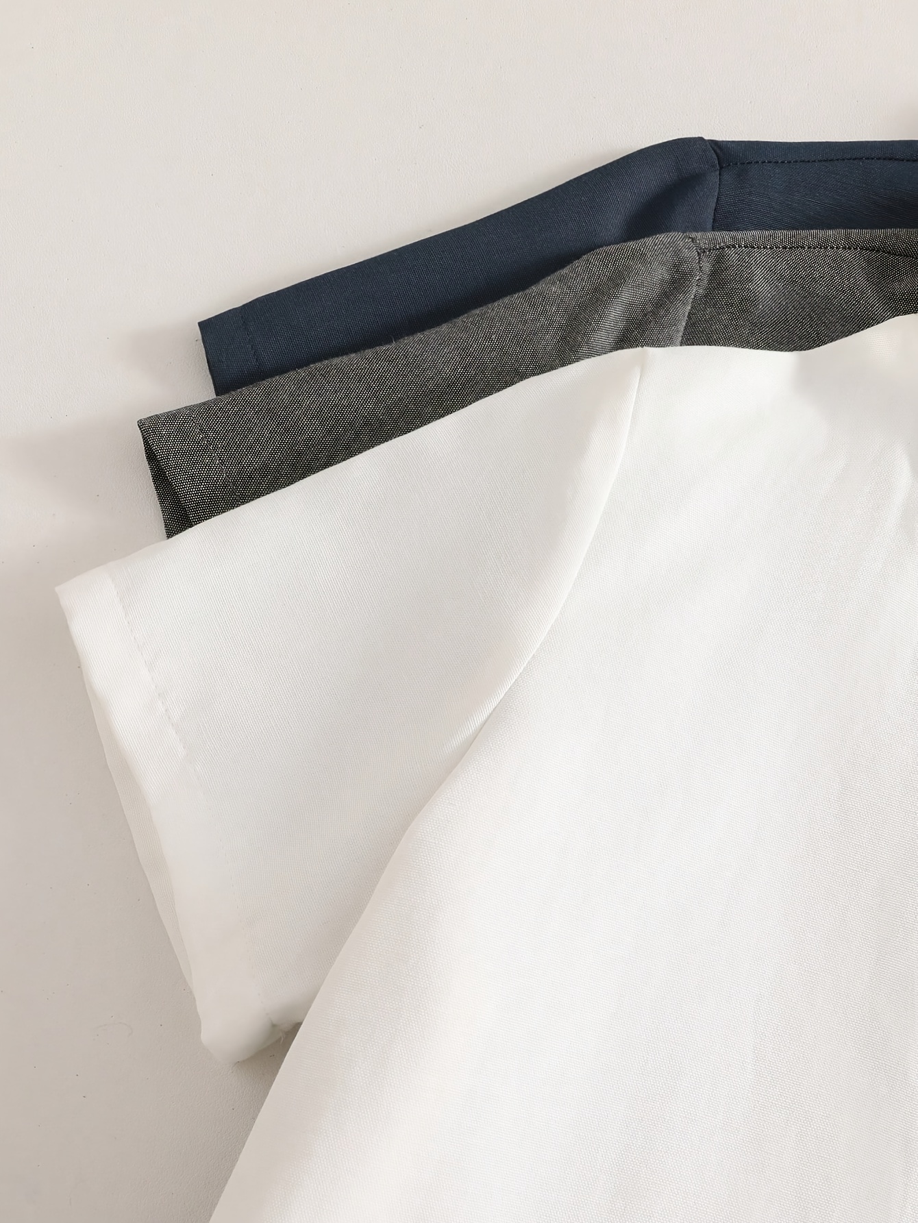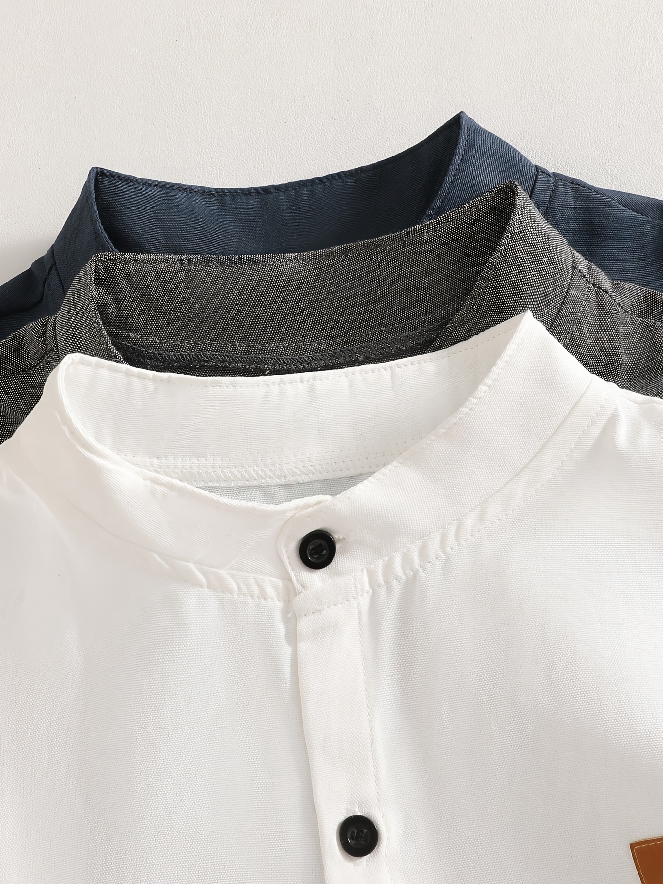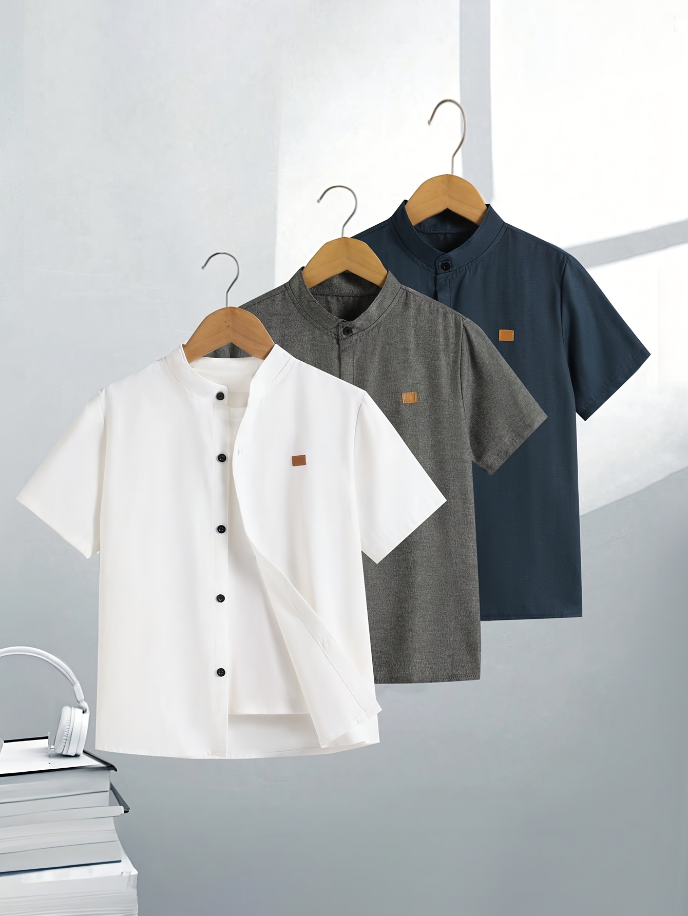 Conjunto de tres camisetas de manga corta para niño, ideales para el verano, con cuello alto. Disponibles en blanco, gris y azul marino. Fabricadas con tejido transpirable para mayor comodidad en contacto con la piel, perfectas para el uso diario y las vacaciones en la playa.
