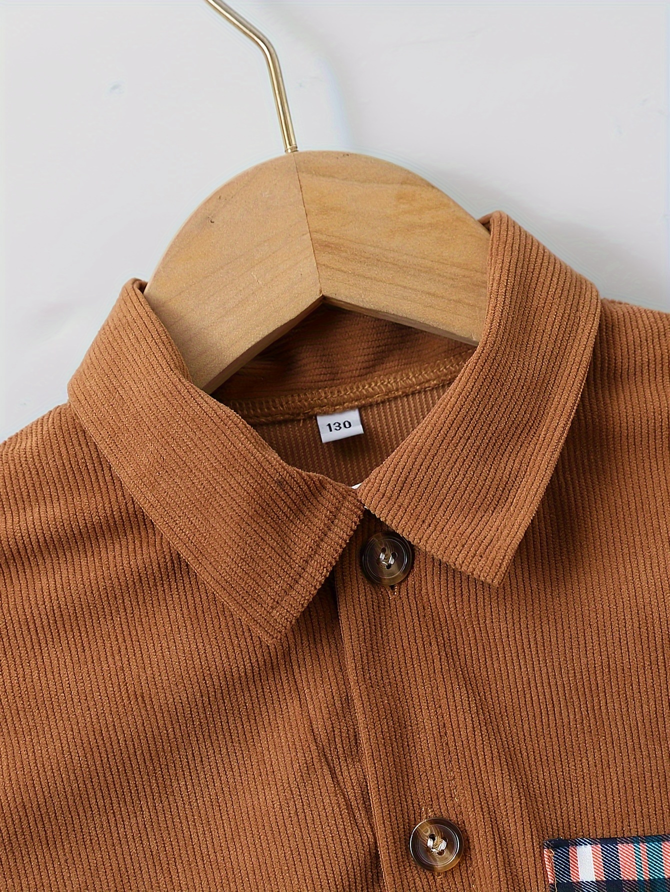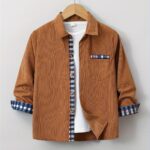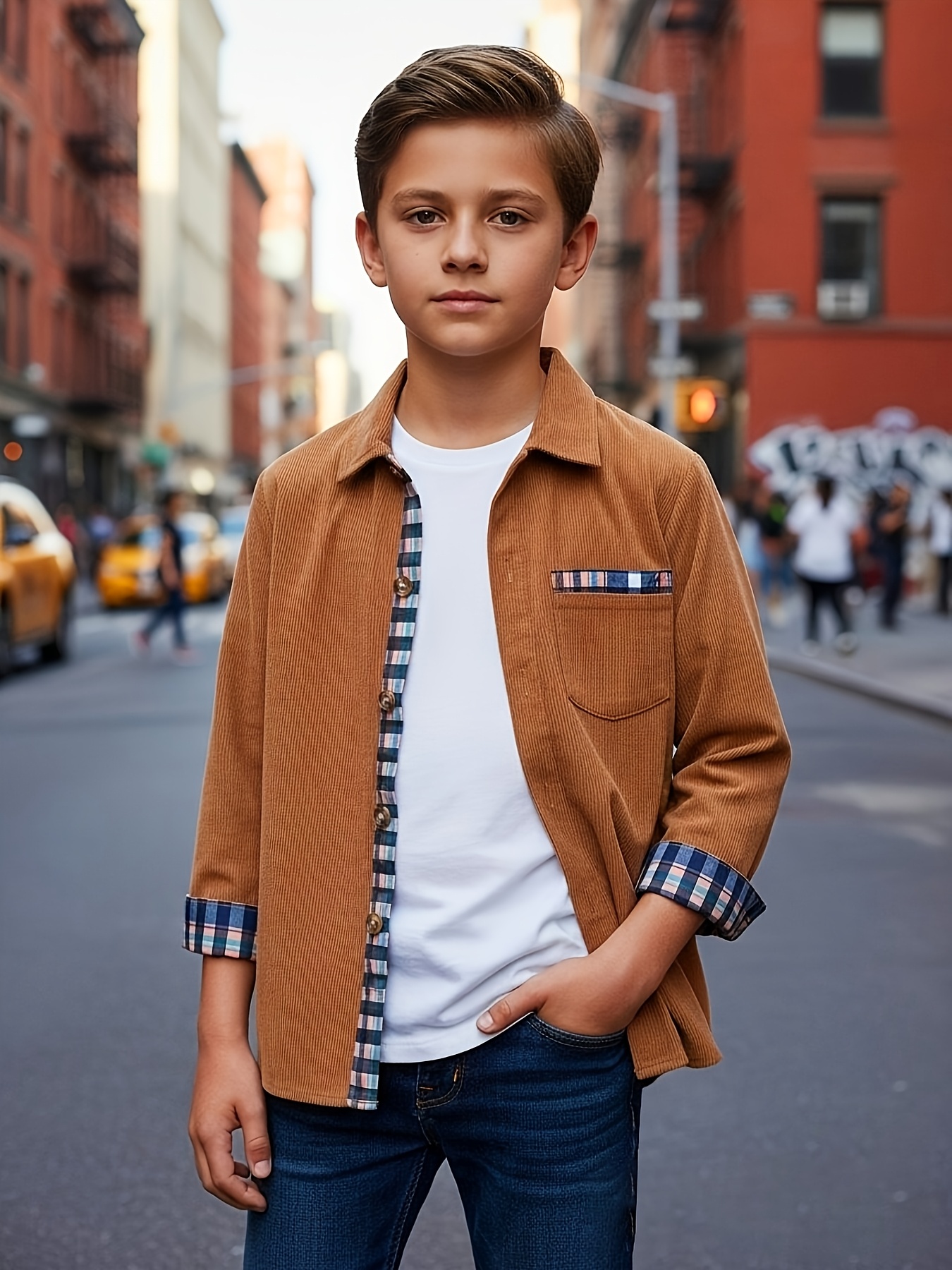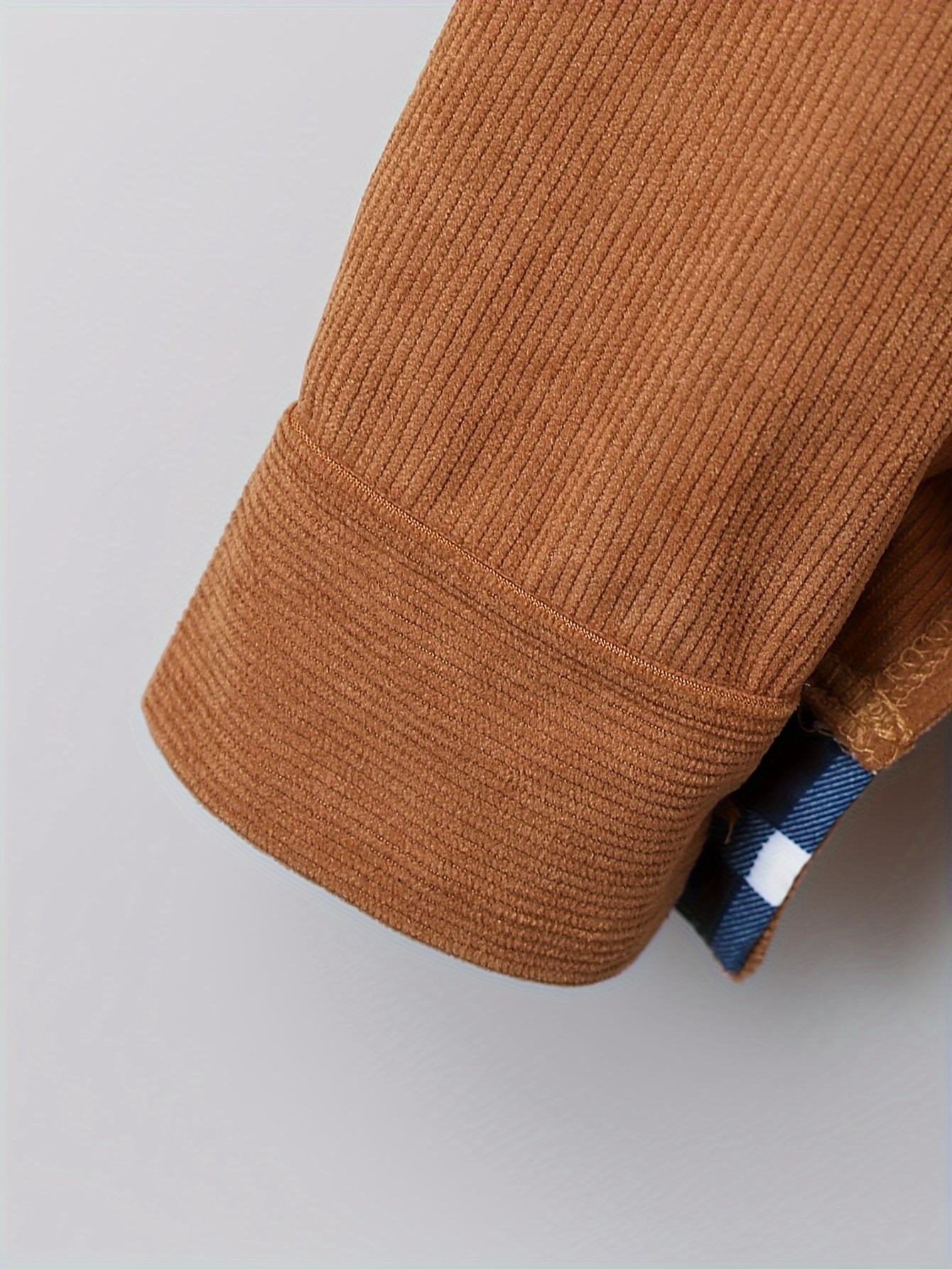 Este es un solo artículo (no incluye ropa interior): una camisa de pana de manga larga, elegante y casual, para edades de 130-170, con un diseño retro de color sólido y patchwork a cuadros, ideal para primavera y otoño.