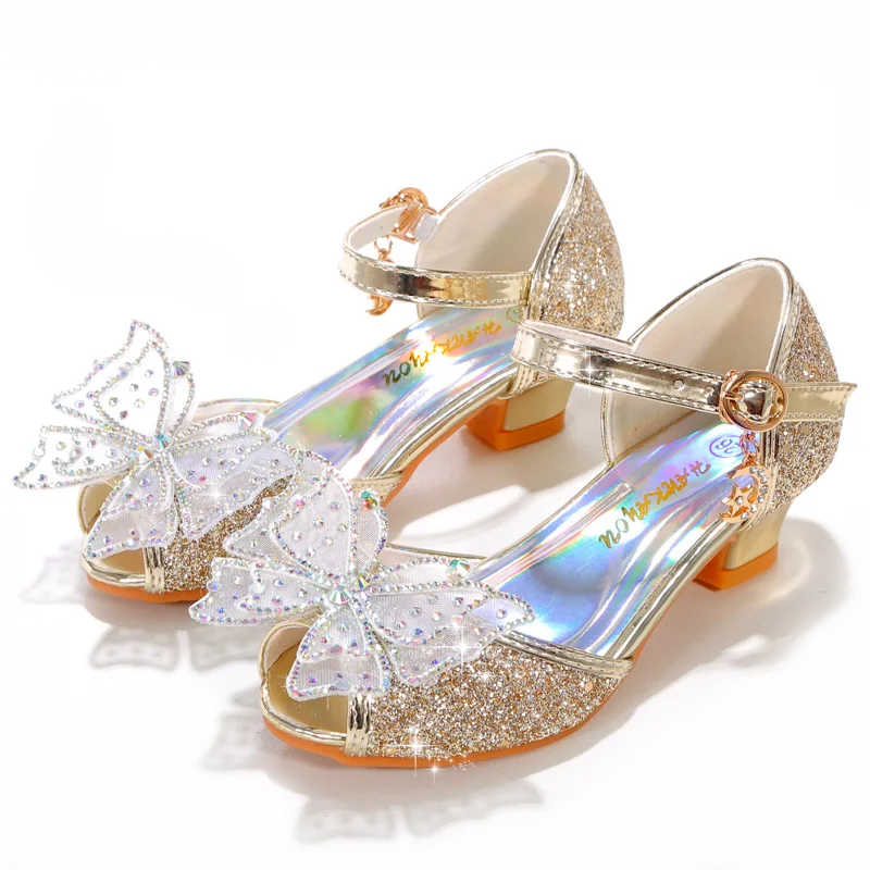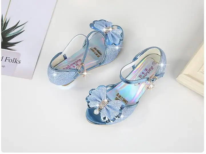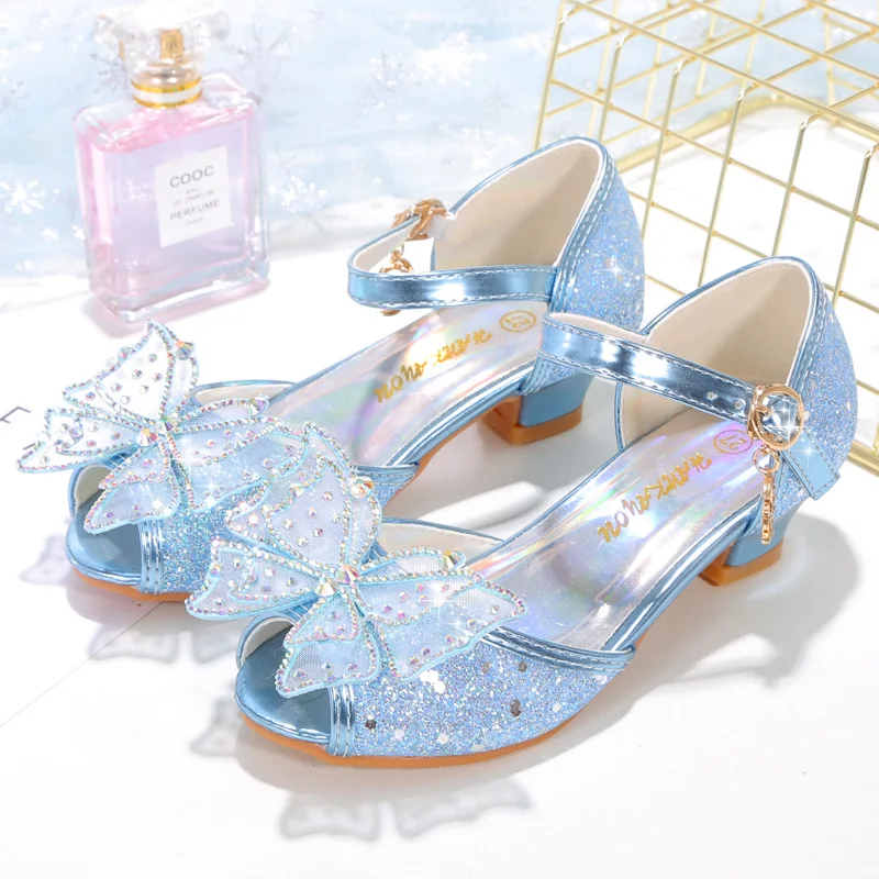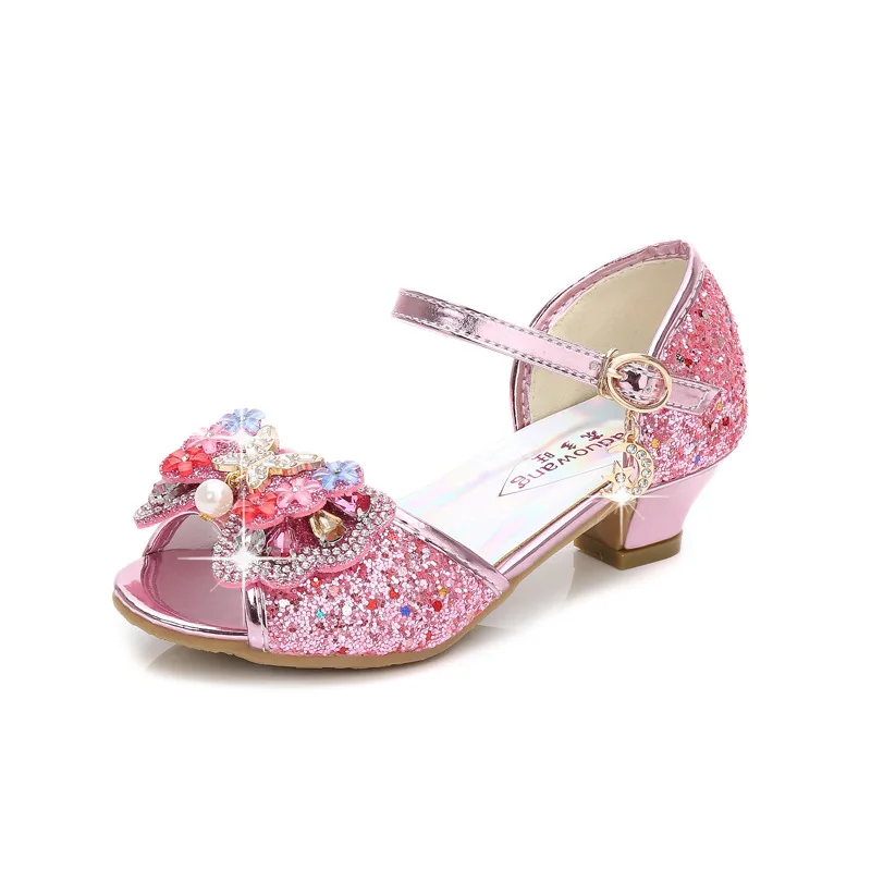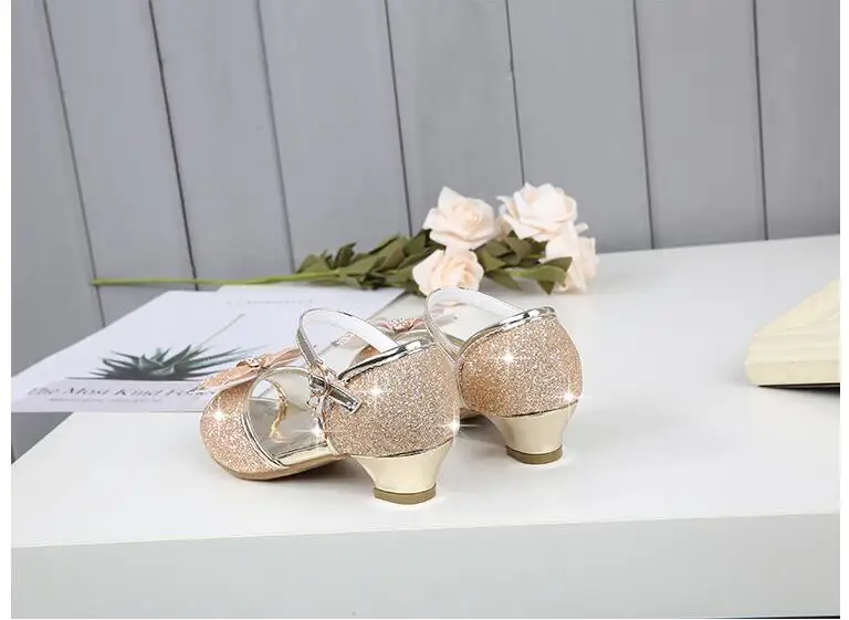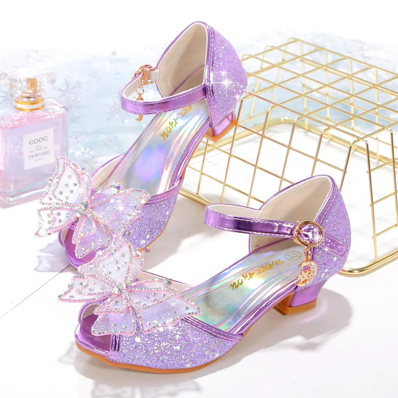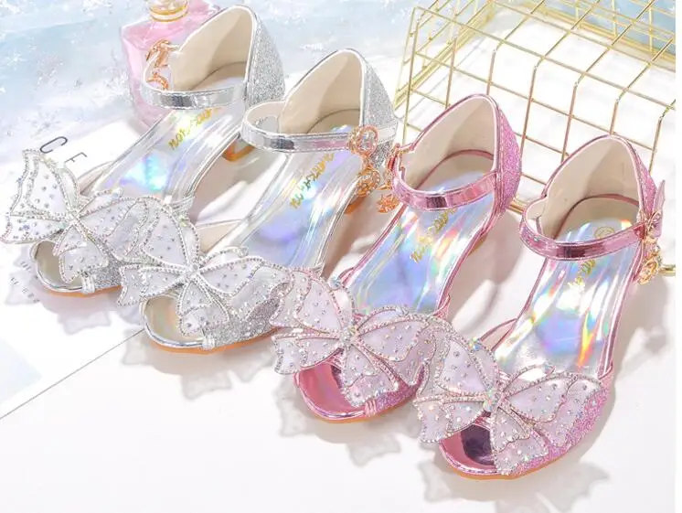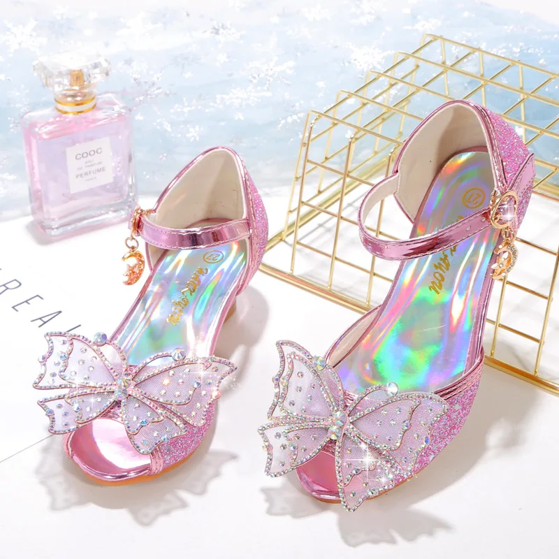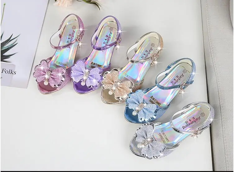 Novedad de verano, zapatos de cuero para niñas, tacones altos, sandalias brillantes de princesa para fiesta, zapatos de boda para niños, zapatos con pajarita