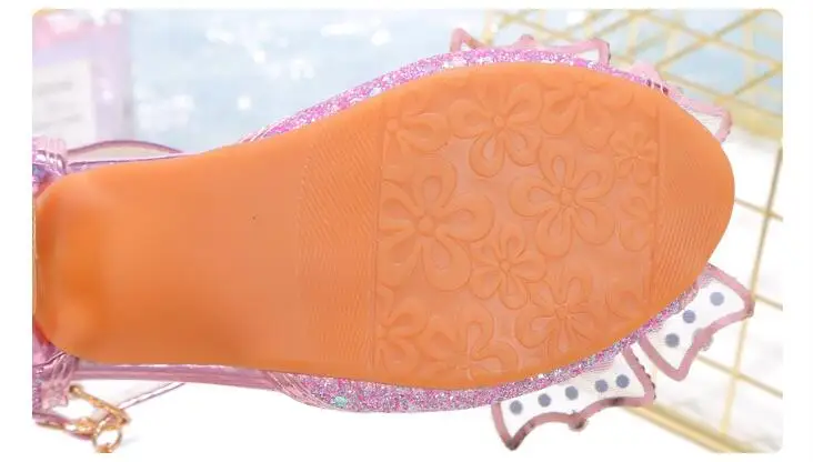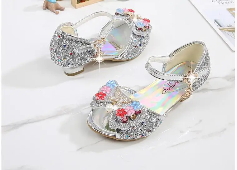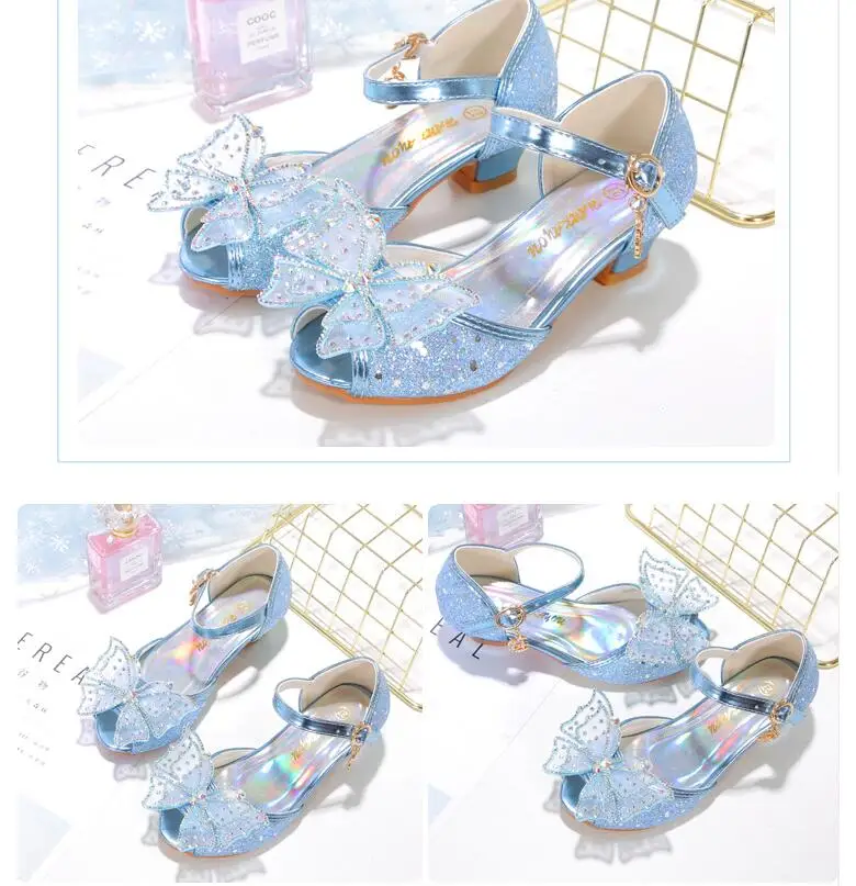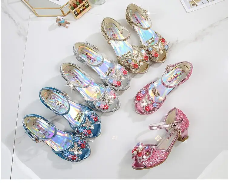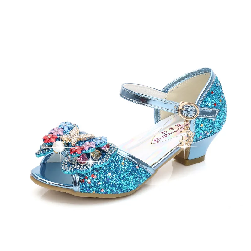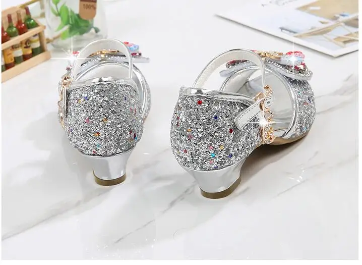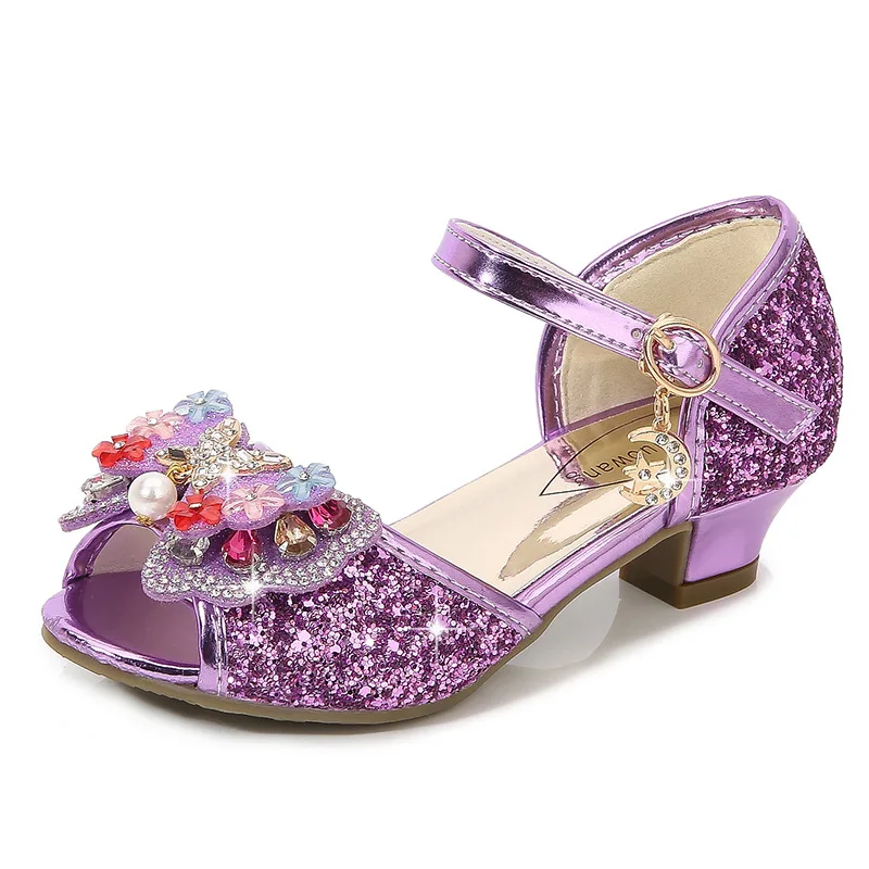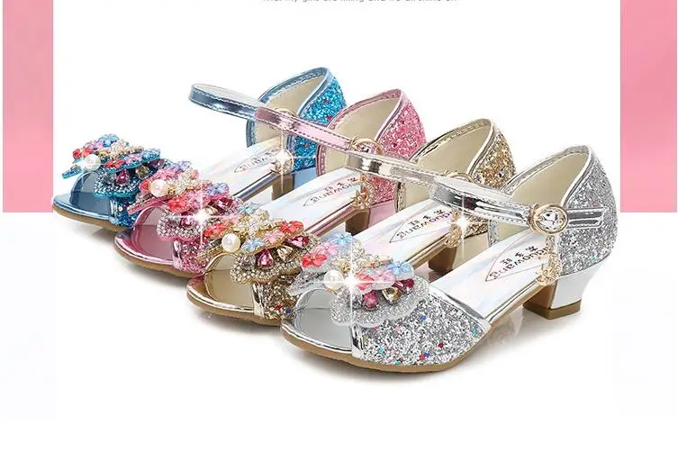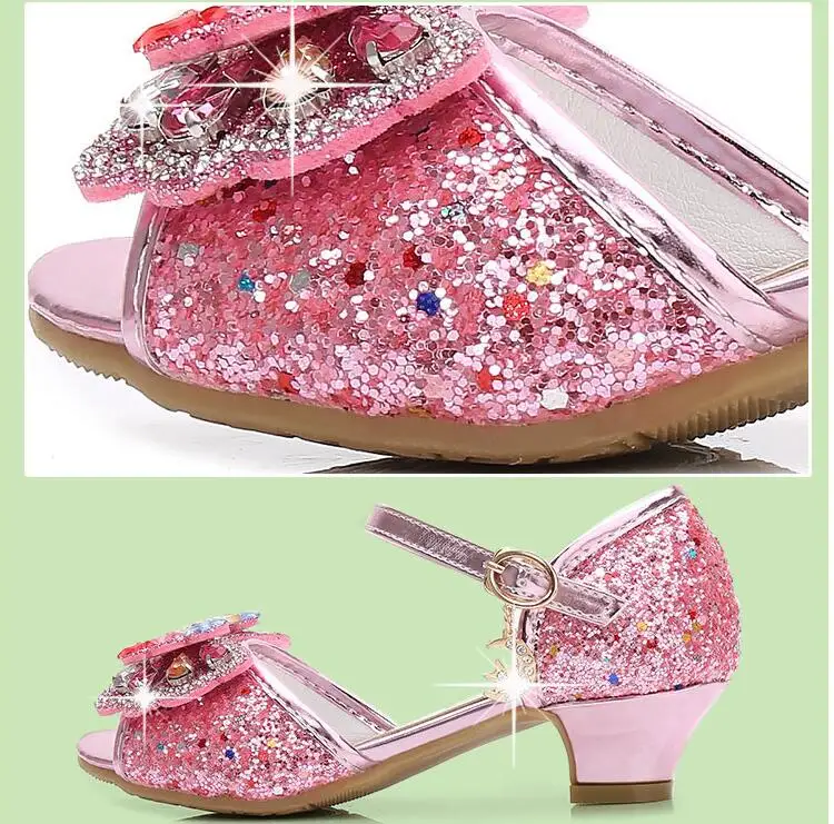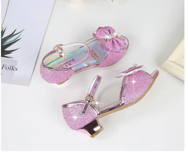 Novedad de verano, zapatos de cuero para niñas, tacones altos, sandalias brillantes de princesa para fiesta, zapatos de boda para niños, zapatos con pajarita