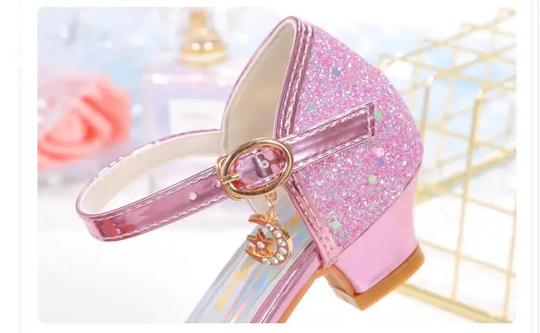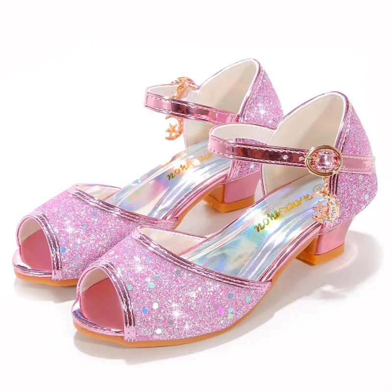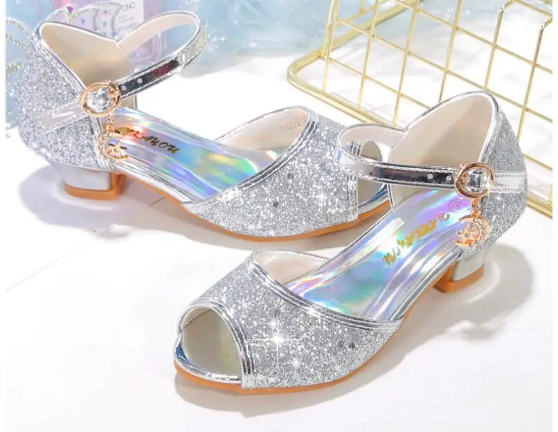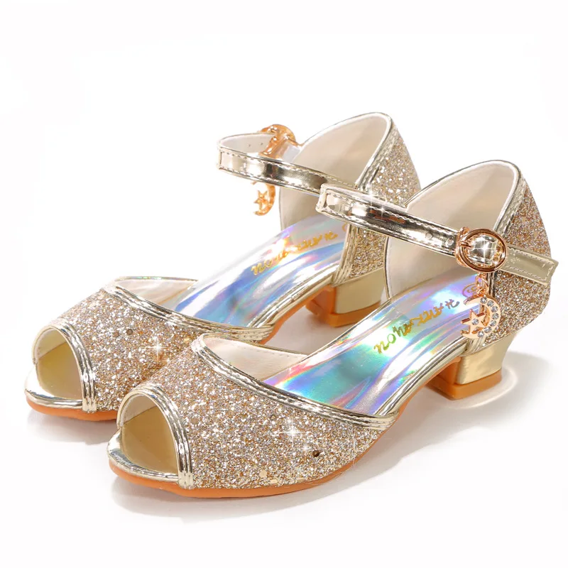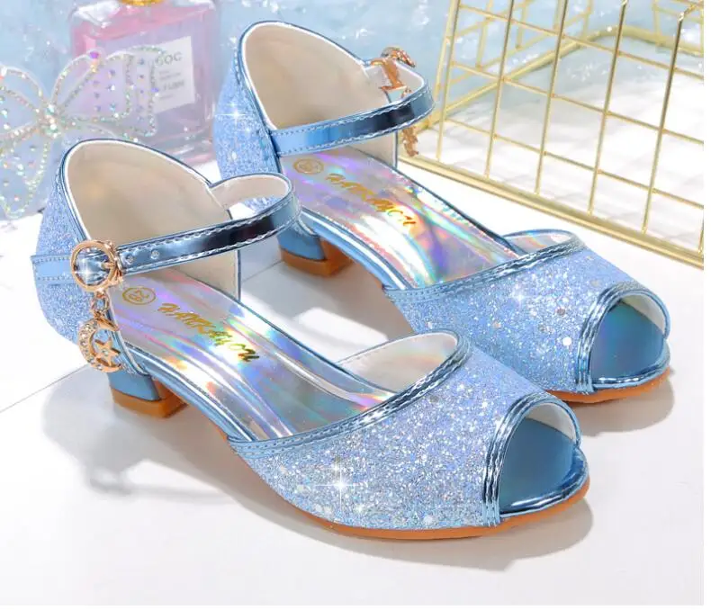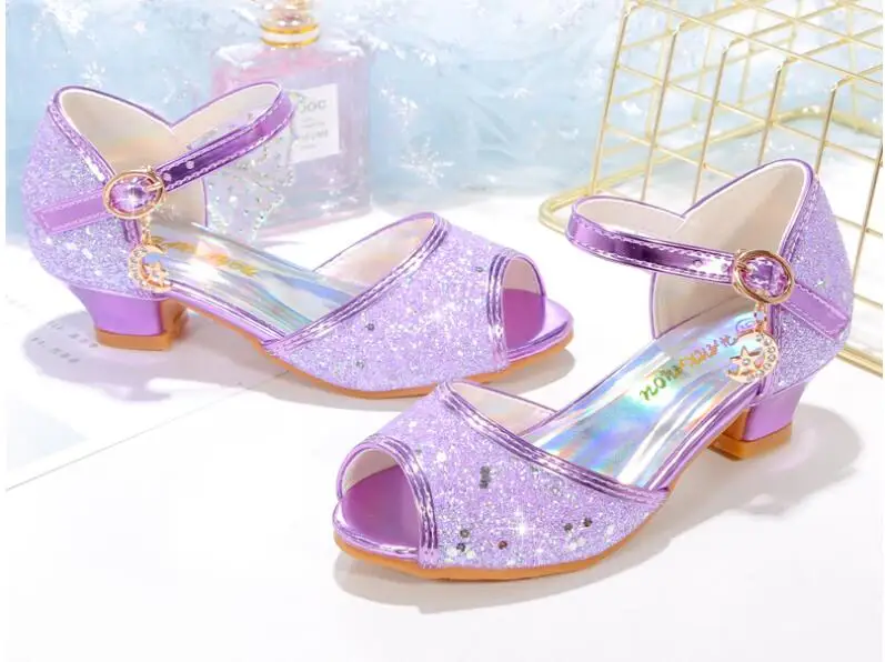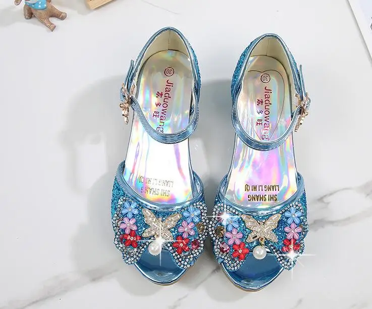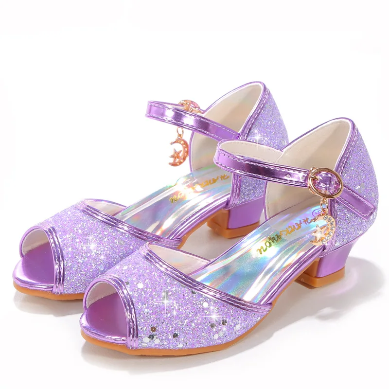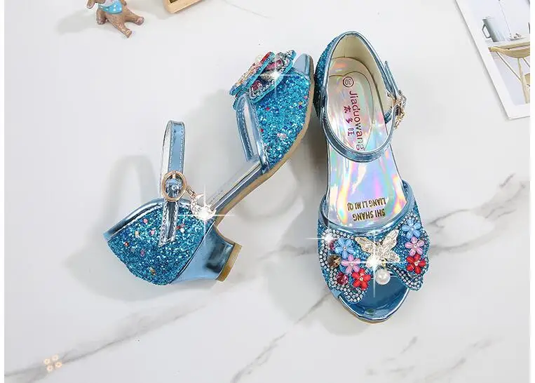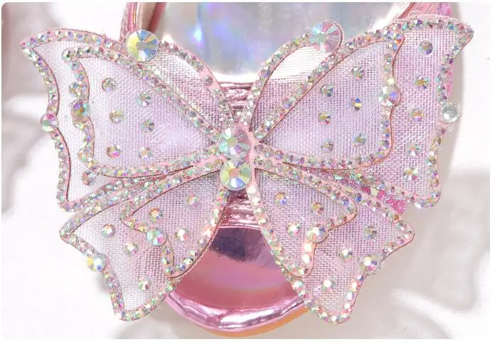 Novedad de verano, zapatos de cuero para niñas, tacones altos, sandalias brillantes de princesa para fiesta, zapatos de boda para niños, zapatos con pajarita