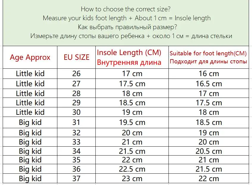 26 insole 17 cm, 27 insole 17.5 cm, 28 insole 18 cm, 29 insole 18.5 cm, 30 insole 19 cm, 31 insole 19.5 cm, 32 insole 20 cm, 33 insole 21 cm, 34 insole 21.5 cm, 35 insole 22 cm, 36 insole 22.5 cm, 37 insole 23 cm
