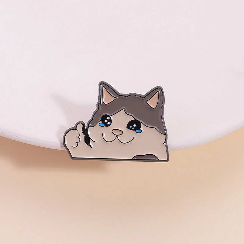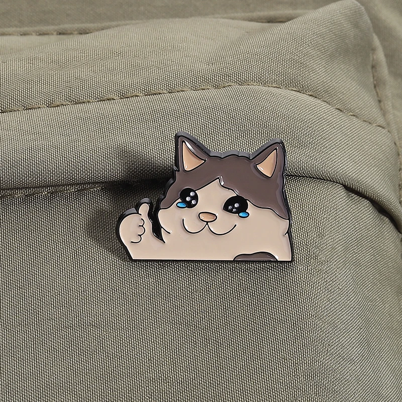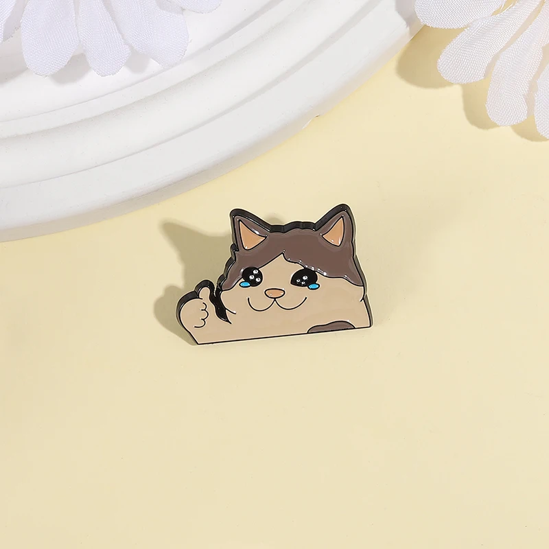 Pin esmaltado de gato llorando pulgar hacia arriba, broche de Animal humorístico Kawaii, insignia para mochila con solapa, regalos divertidos de joyería para amantes de los gatos y amigos