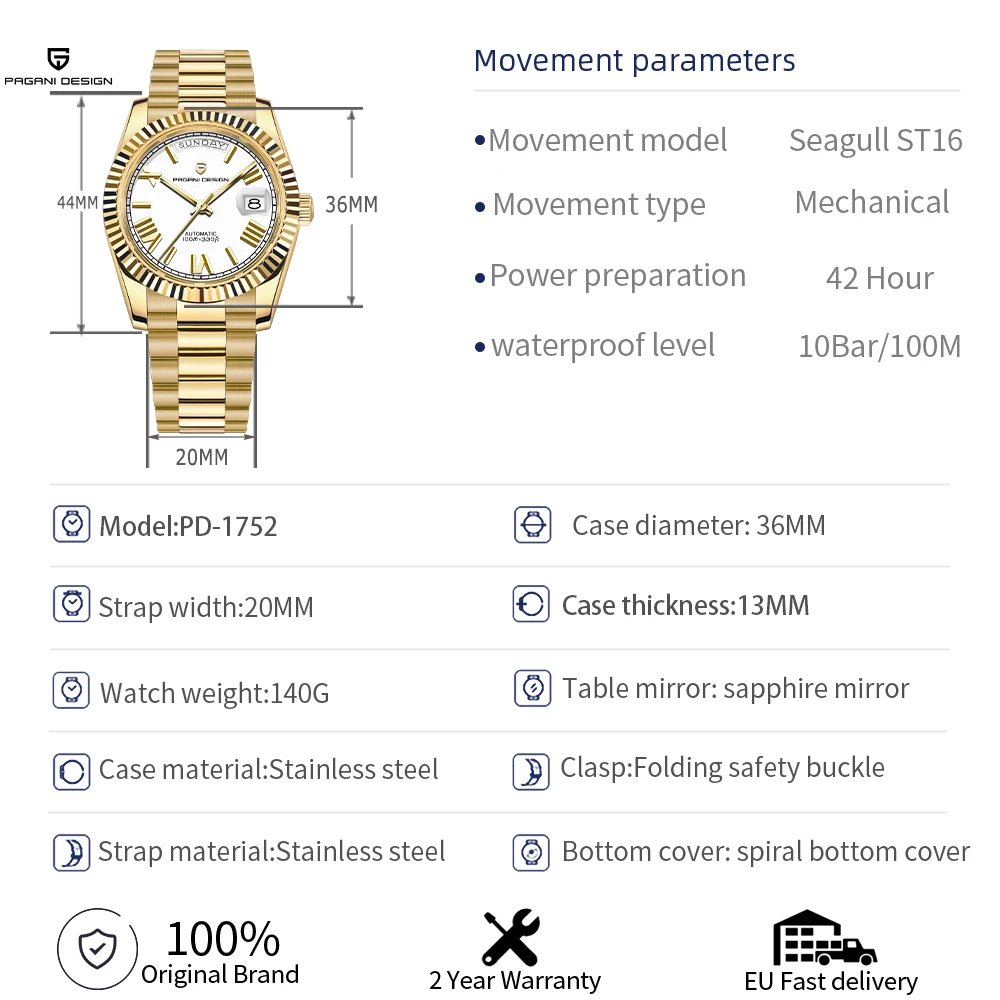 Reloj Automático de Lujo PAGANI DESIGN 2026 Nuevo DD40 Dorado y Blanco para Hombre, TMI NH36A, Fecha, Semana, 100M Resistente al Agua, Relojes Mecánicos para Hombre