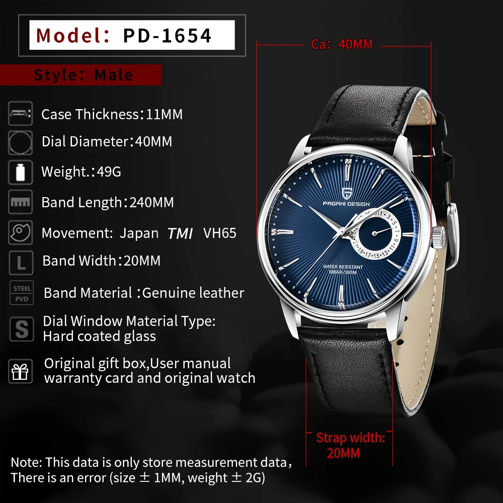 Modelo: PD-1654 Estilo: Masculino Grosor de la caja: 11MM Diámetro del dial: 40MM Peso: 49 gramos Longitud de la correa: 240 mm Movimiento: Japón TMI VH65 Ancho de banda: 20MM Material de la banda: cuero genuino Tipo de material de la ventana del dial: Vidrio con revestimiento duro Caja de regalo original, manual de usuario, tarjeta de garantía y reloj original Nota: Estos datos solo almacenan datos de medición. Hay un error (tamaño ± 1MM, peso ± 2G)