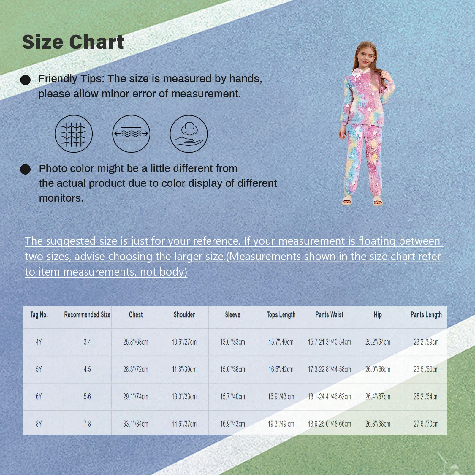 | Número de etiqueta. | Tamaño recomendado | Pecho | Hombro | Sleeve | Longitud de la parte superior | Pantalones cintura | Cadera | Longitud de los pantalones |
