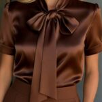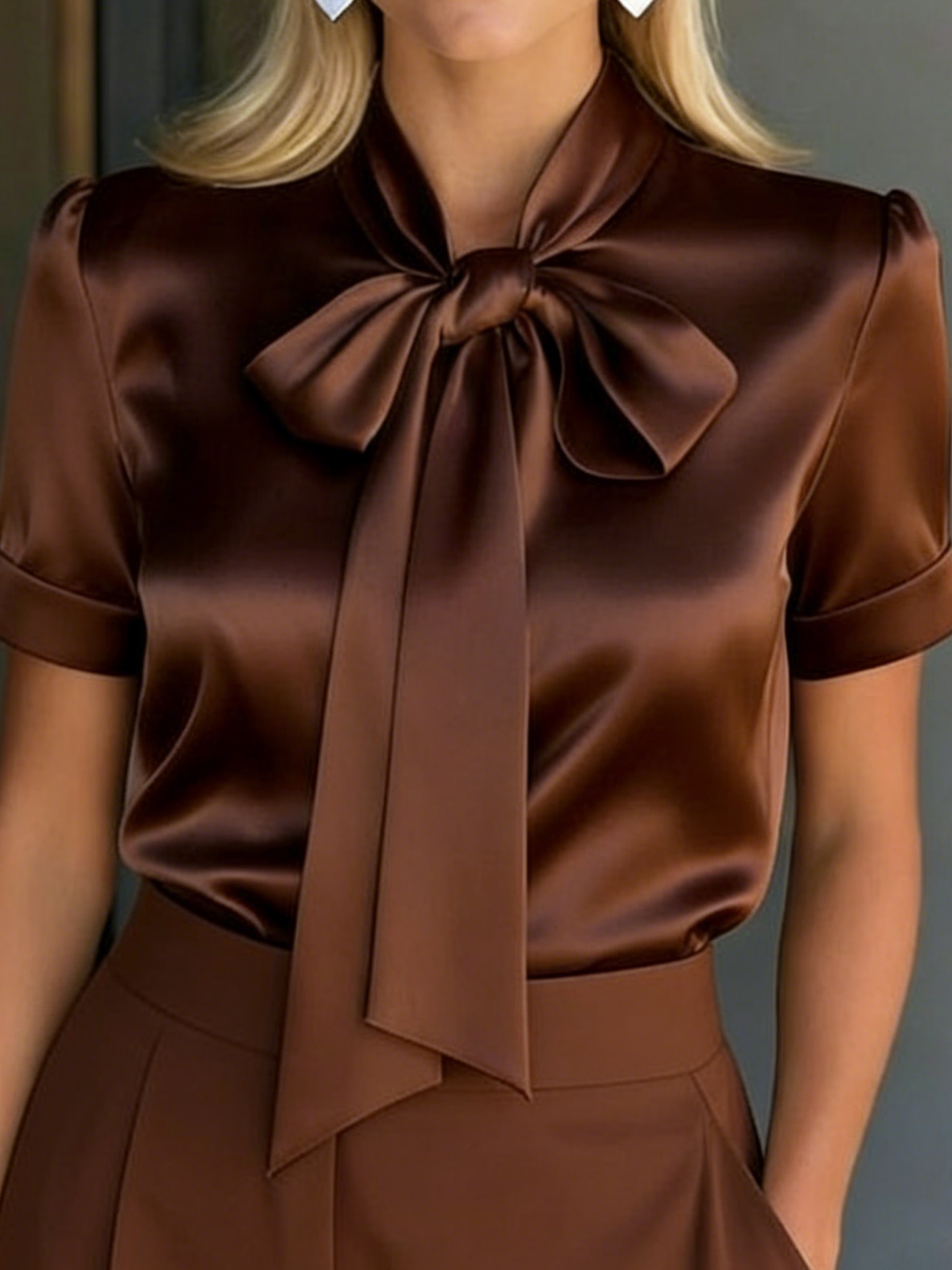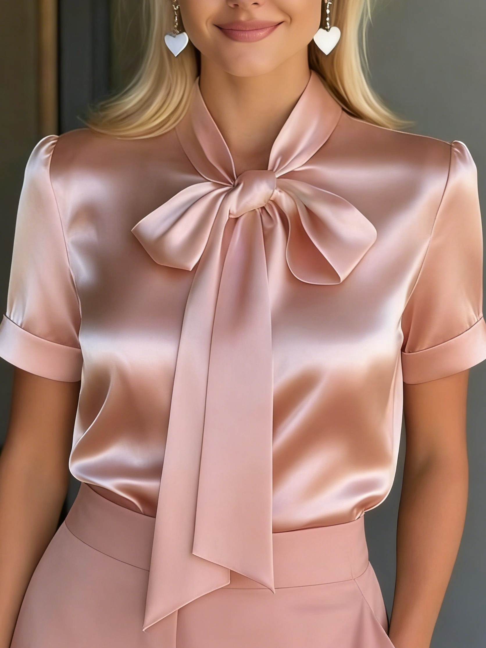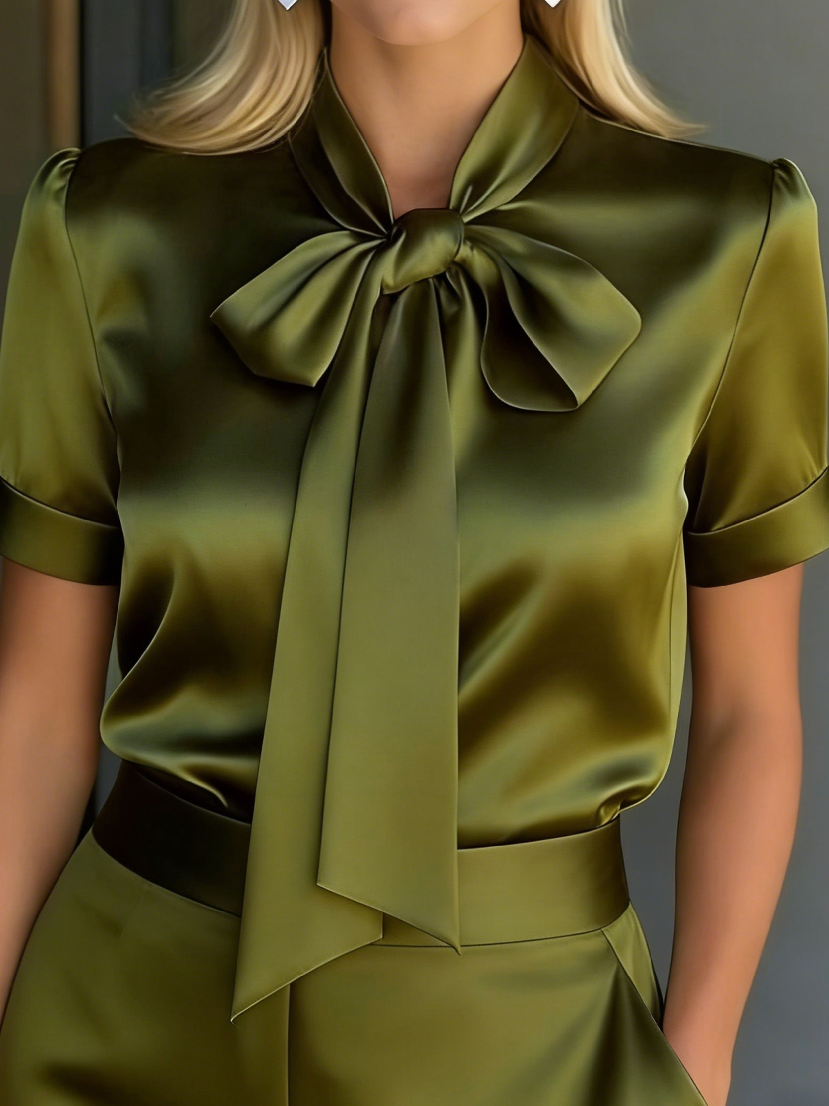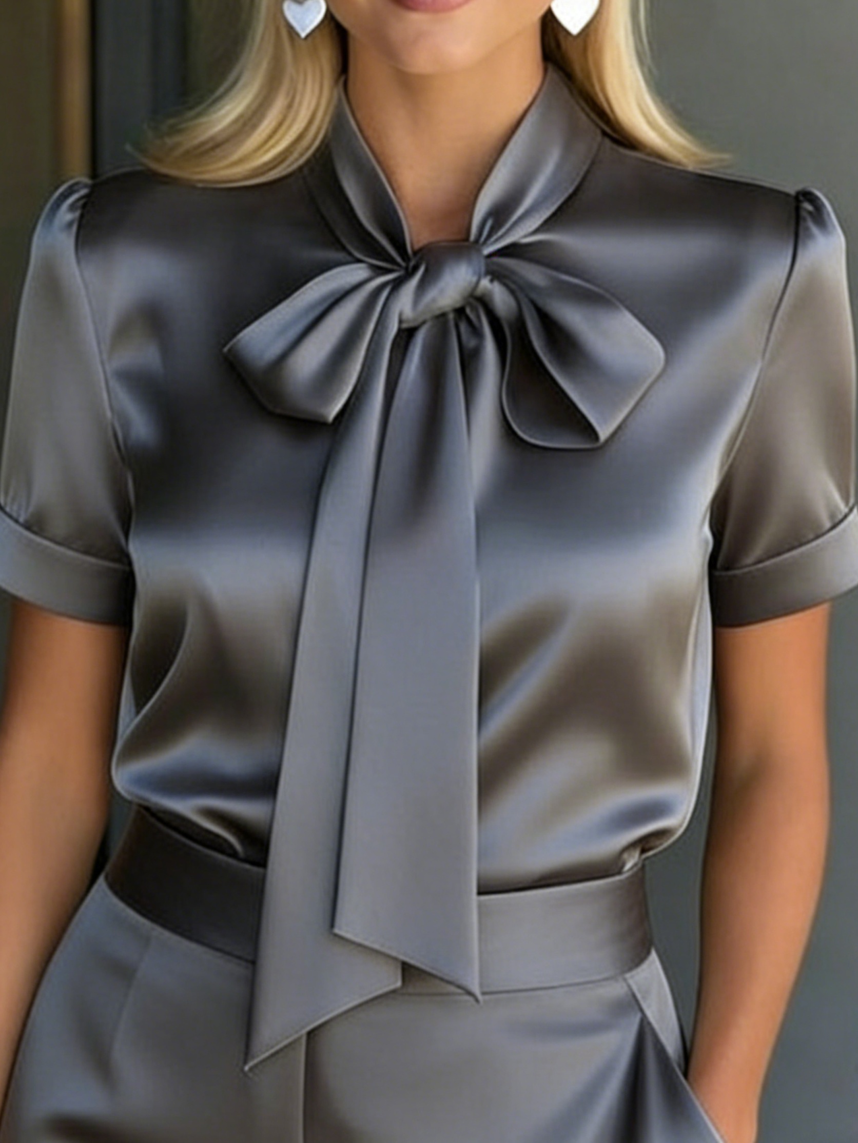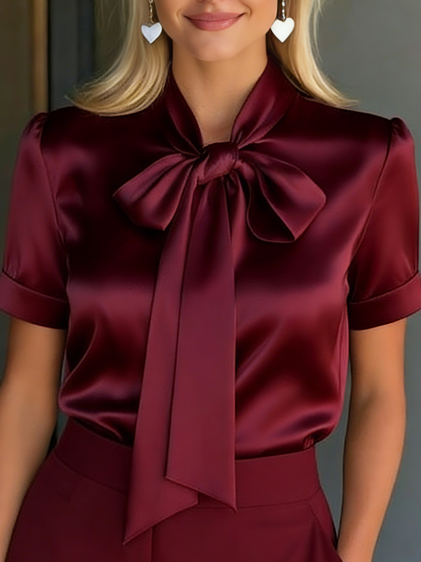 Top de manga corta con cuello de lazo para mujer | Textura de satén, elegante y moderno, ideal para la oficina y fiestas en primavera/verano/otoño, lavable a máquina, color liso, cuello en V