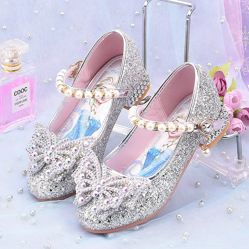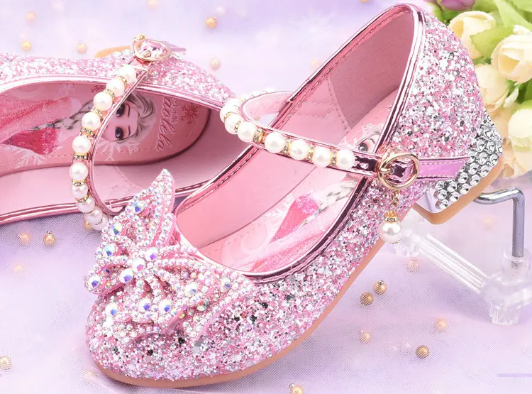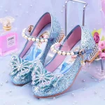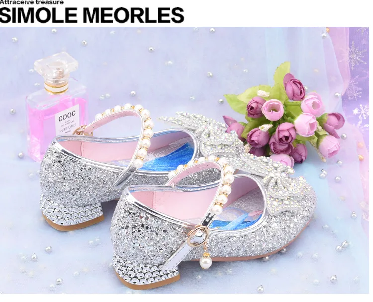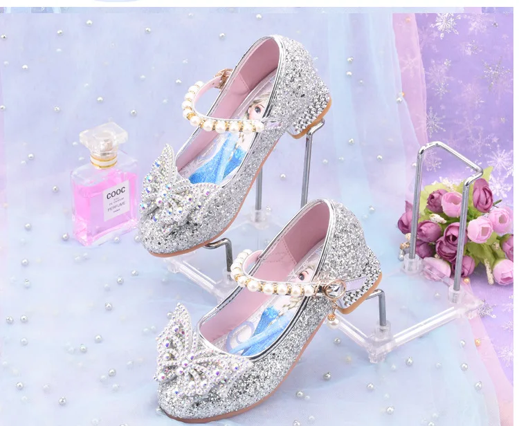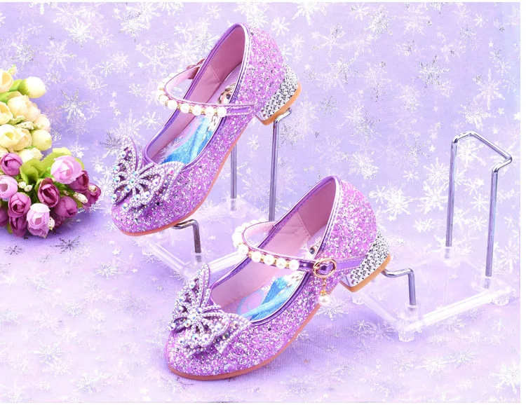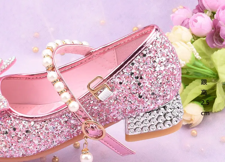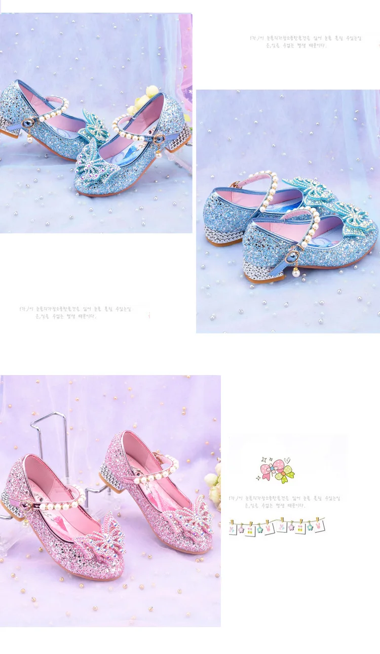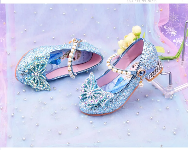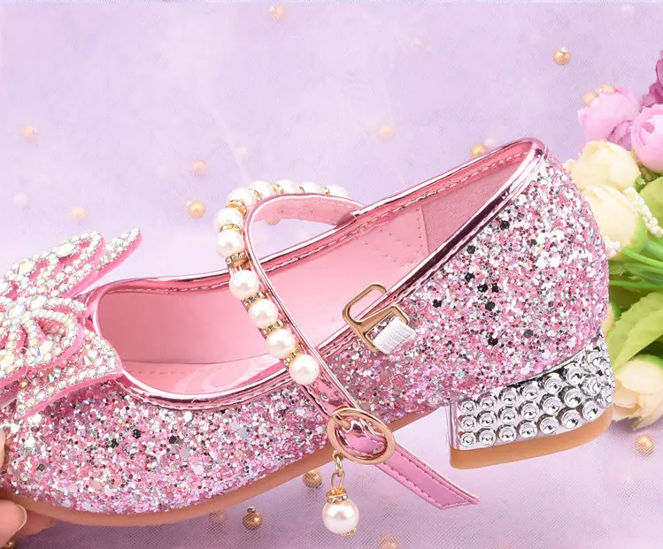 Zapatos de cuero de princesa para niñas, zapatos informales con purpurina y flores, zapatos de tacón alto para niñas, Nudo de mariposa, azul, rosa y plateado