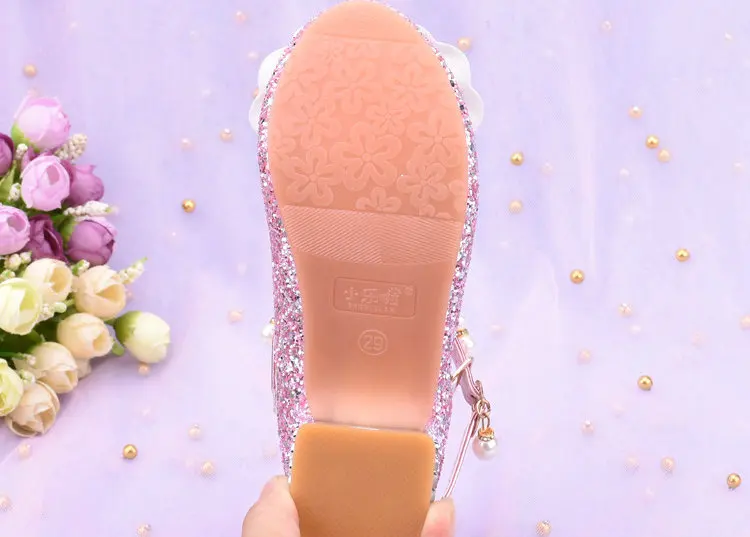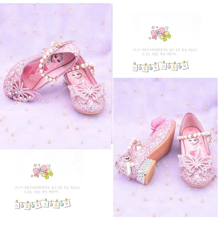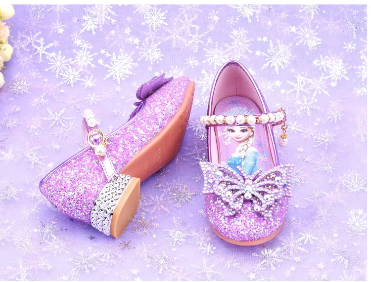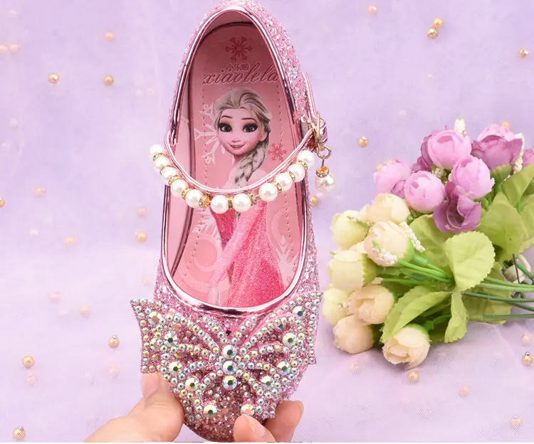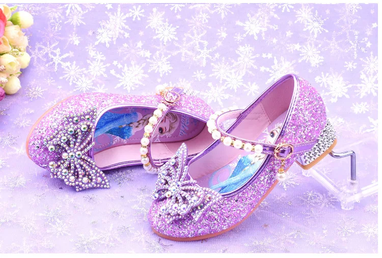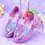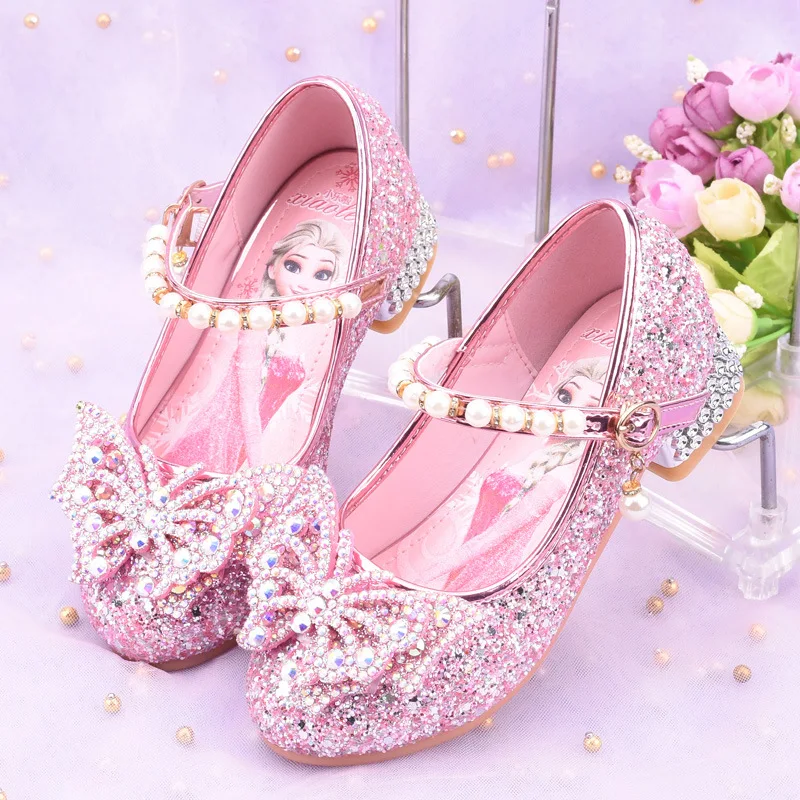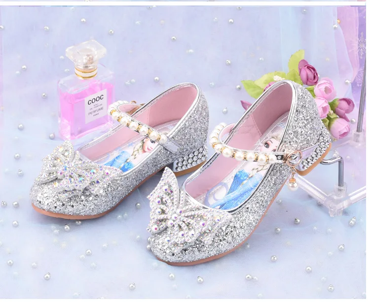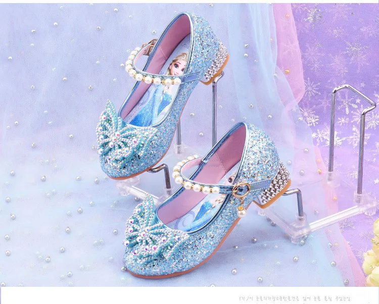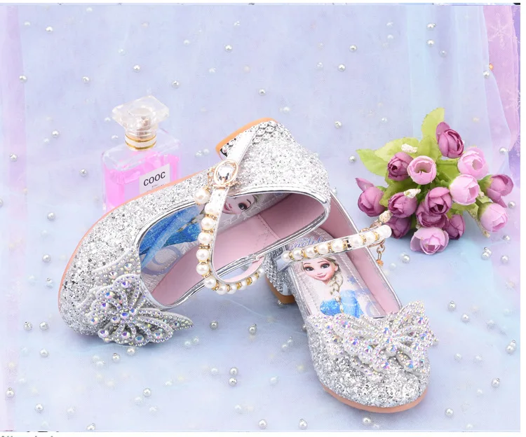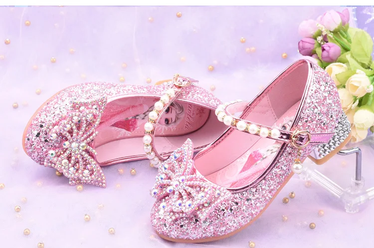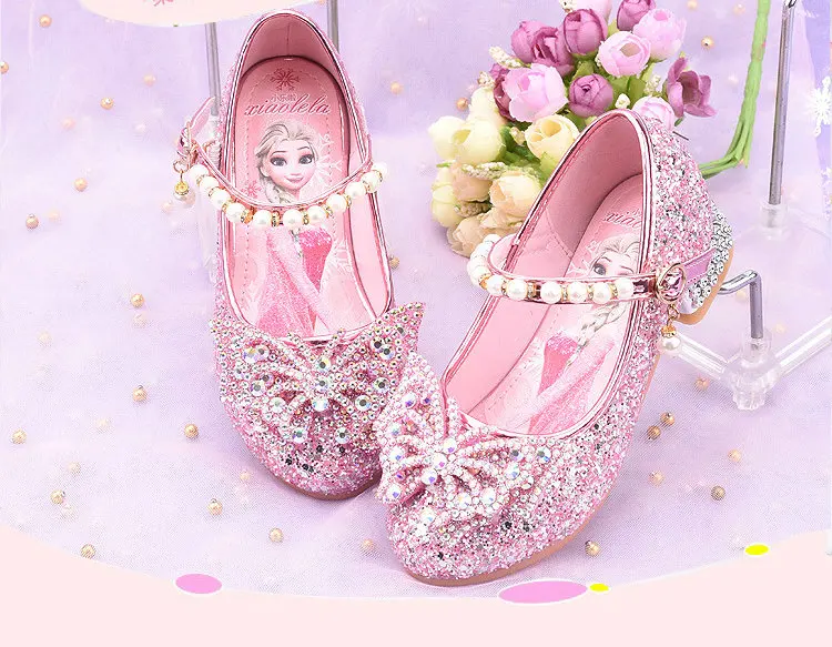 Zapatos de cuero de princesa para niñas, zapatos informales con purpurina y flores, zapatos de tacón alto para niñas, Nudo de mariposa, azul, rosa y plateado