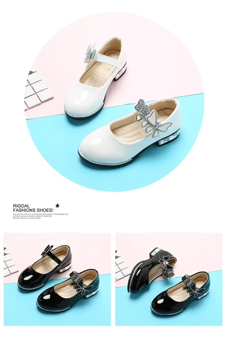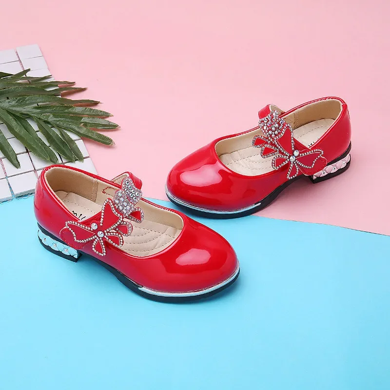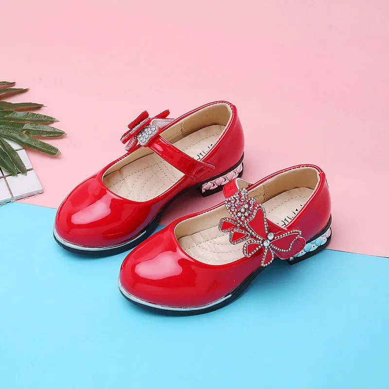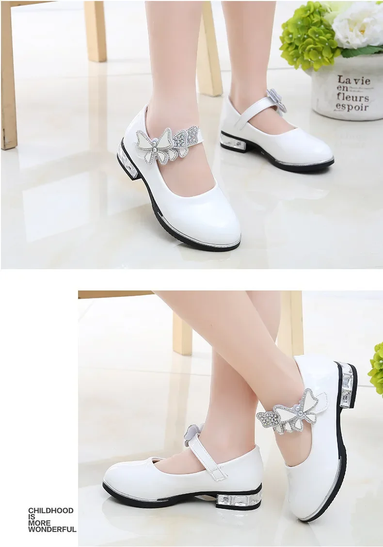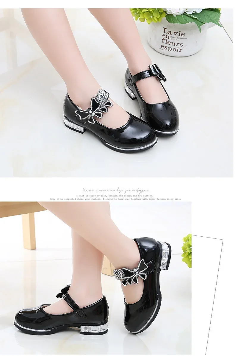 Zapatos de cuero para niñas para fiesta, boda, zapatos de rendimiento para niños con nudo de mariposa, zapatos de tacón alto con diamantes de imitación a la moda para niños