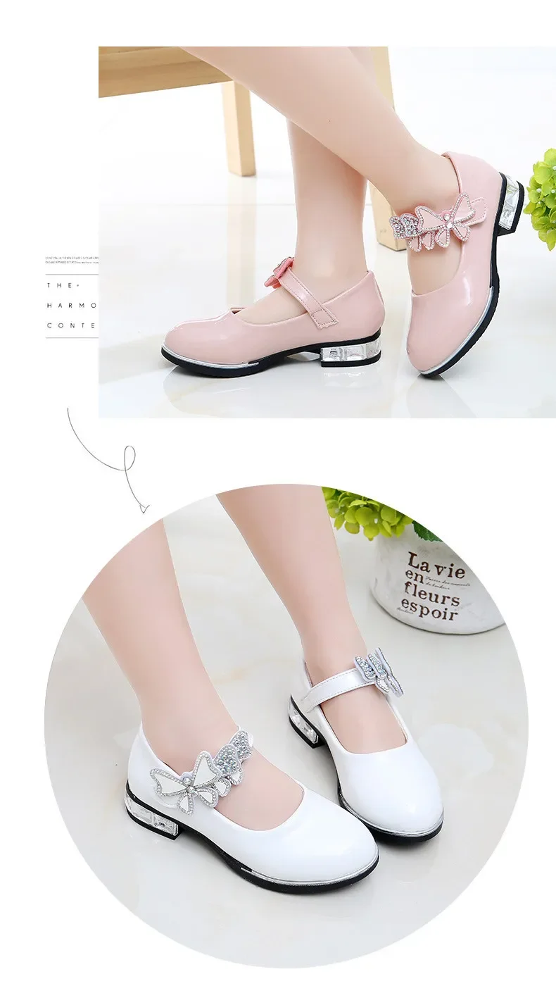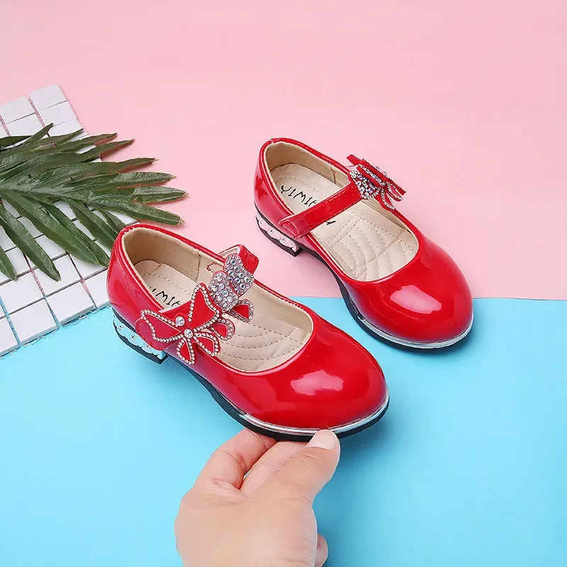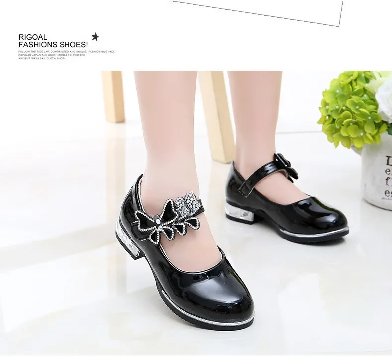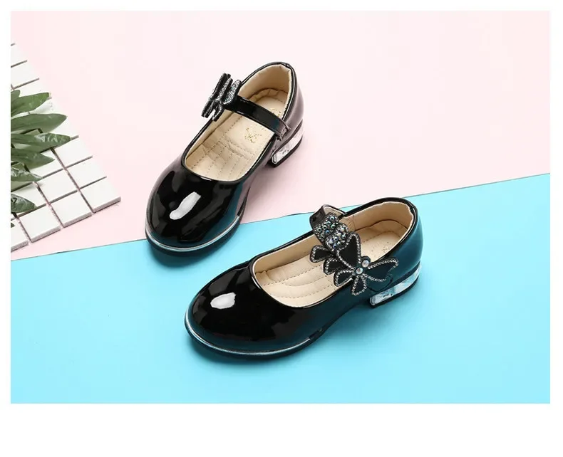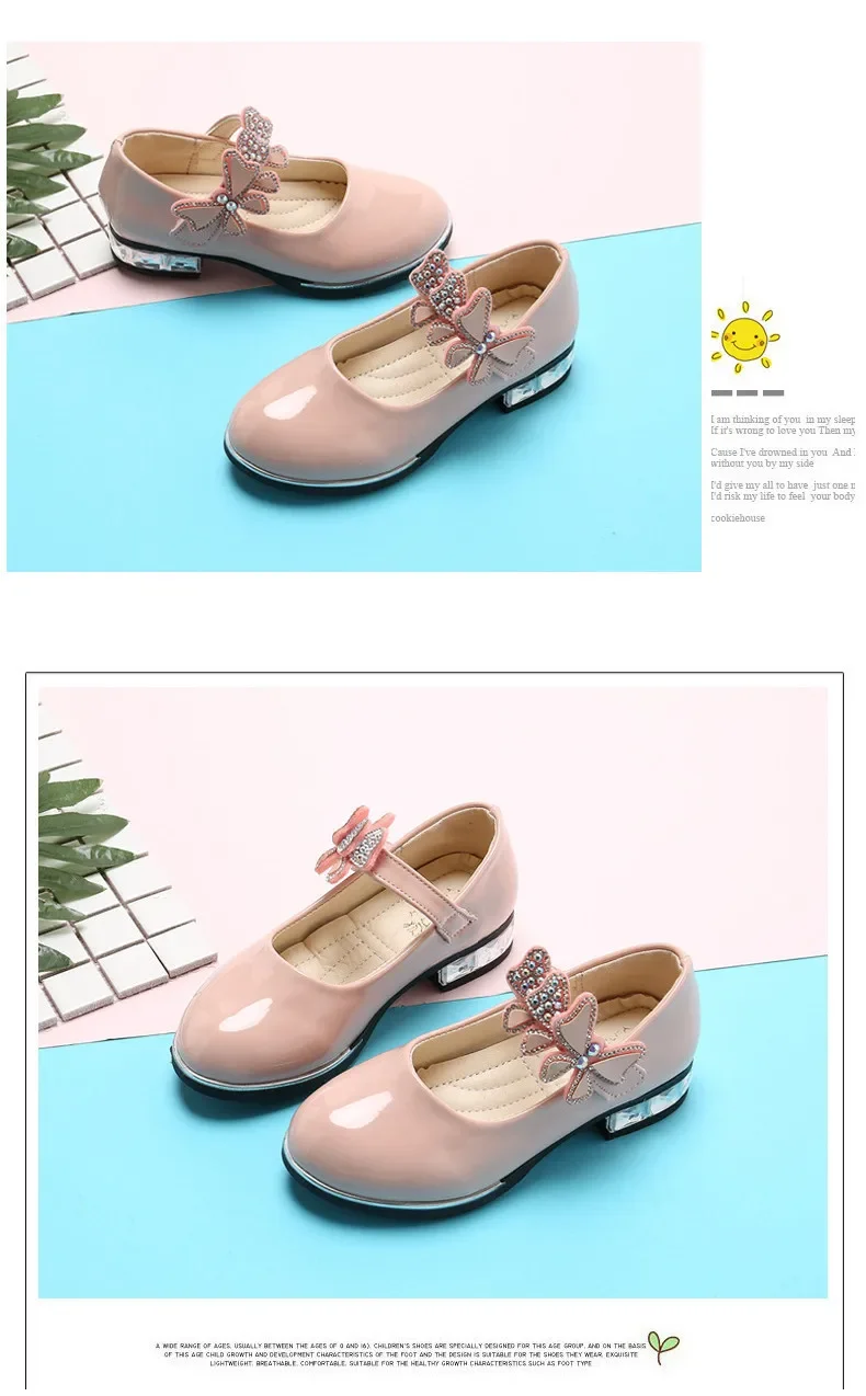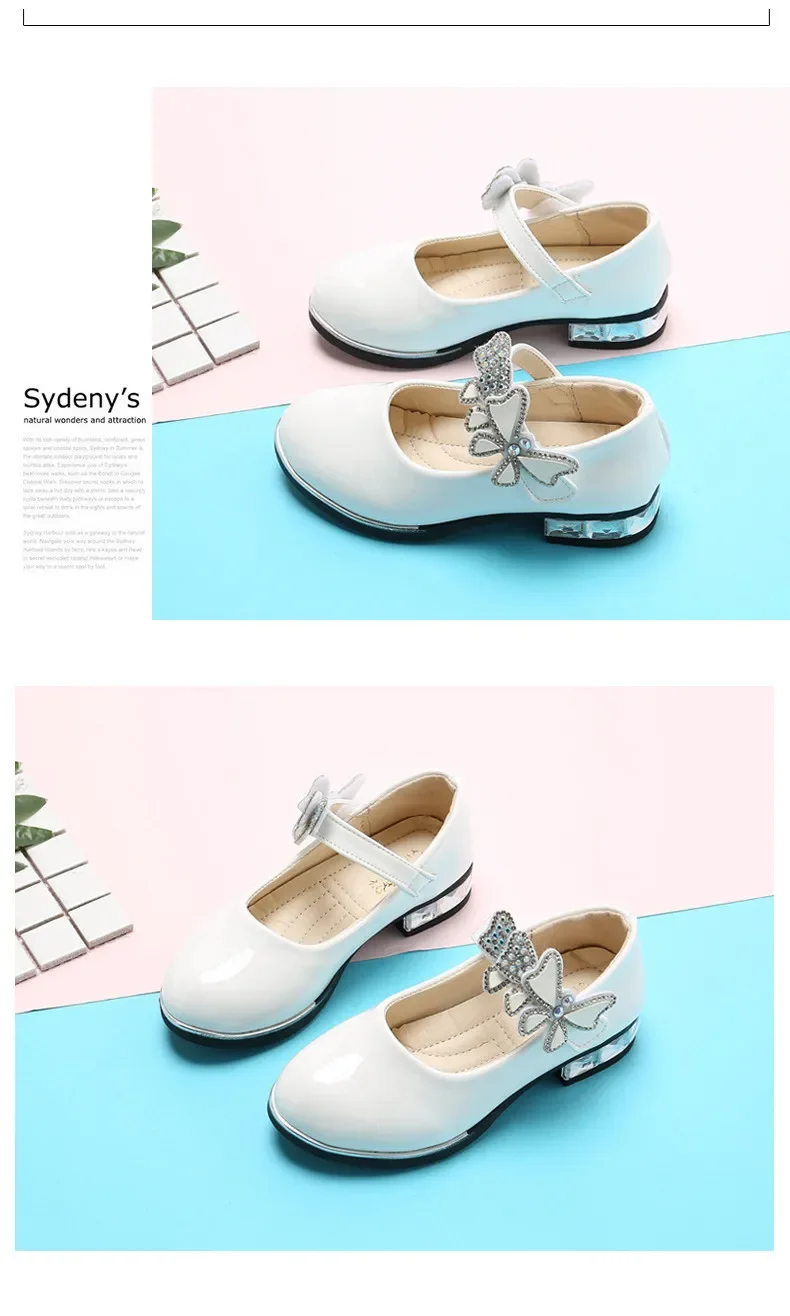 Zapatos de cuero para niñas para fiesta, boda, zapatos de rendimiento para niños con nudo de mariposa, zapatos de tacón alto con diamantes de imitación a la moda para niños