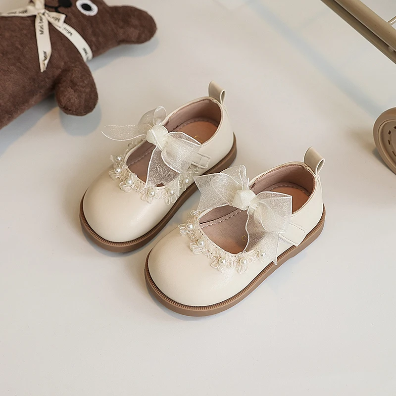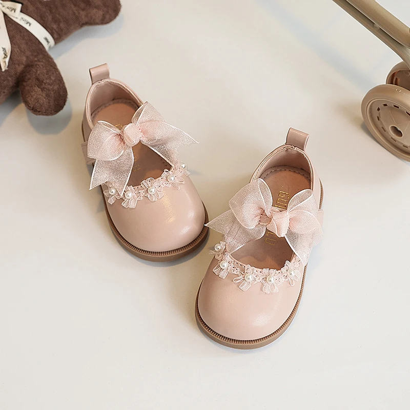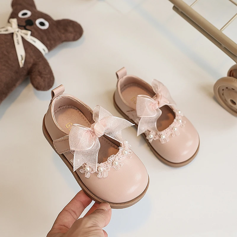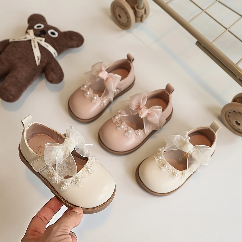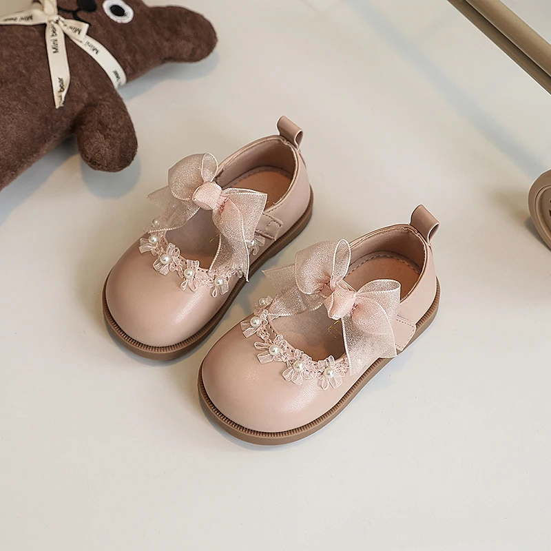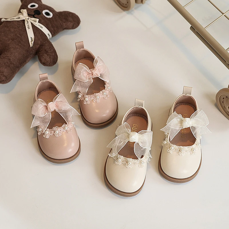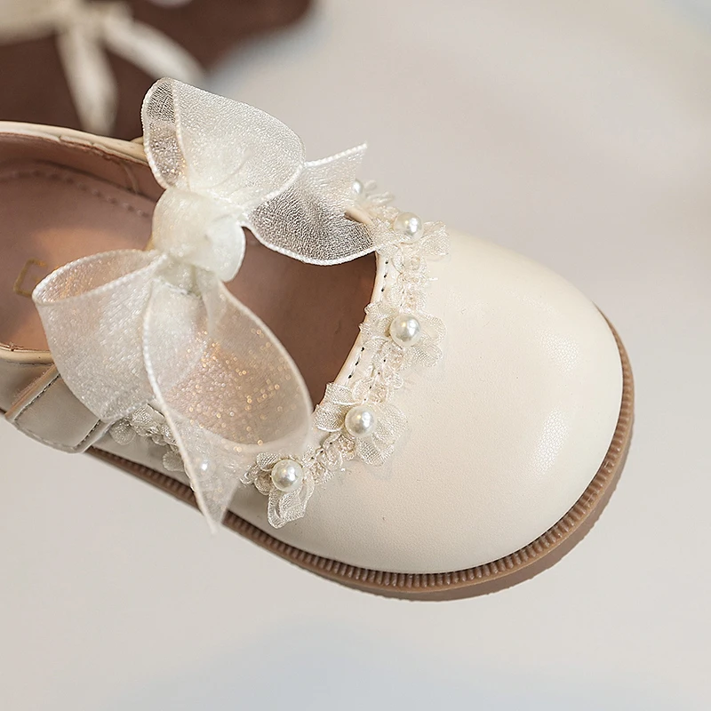 Zapatos de cuero para niñas pequeñas, zapatos planos de princesa para fiesta de boda, pajarita de encaje Mary Jane con cuentas, zapatos planos de primavera 2025 para niños, novedad