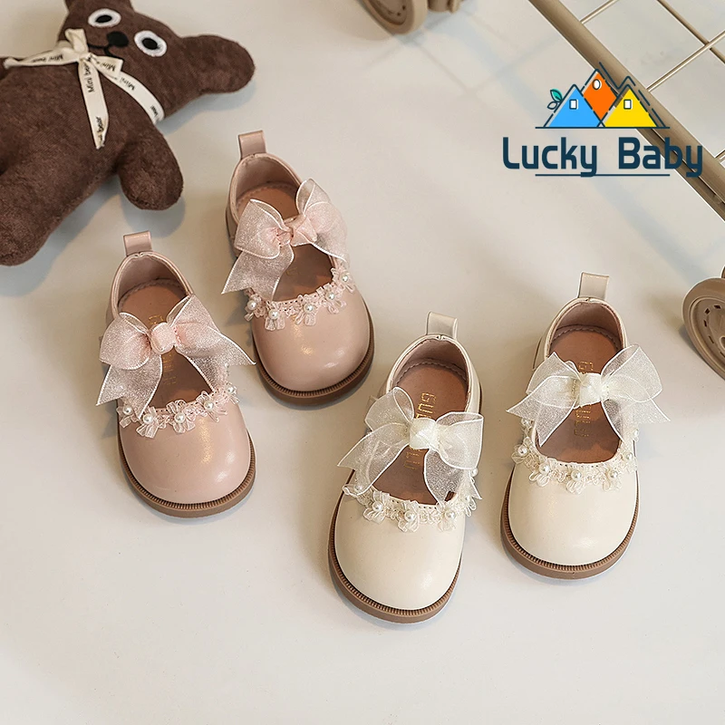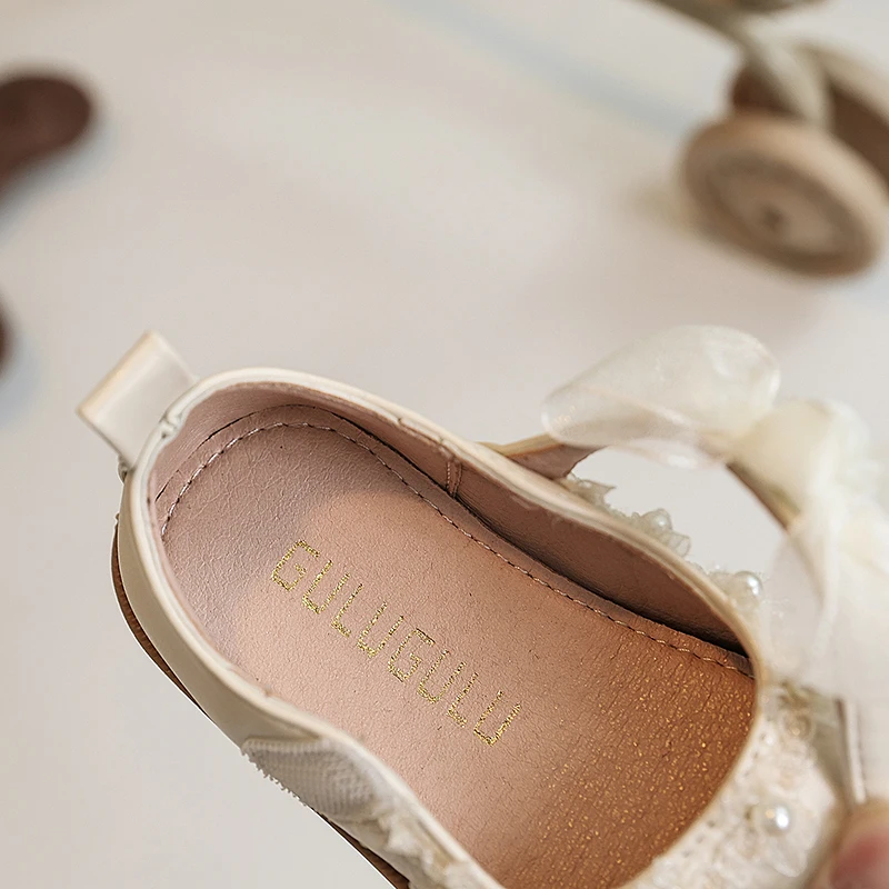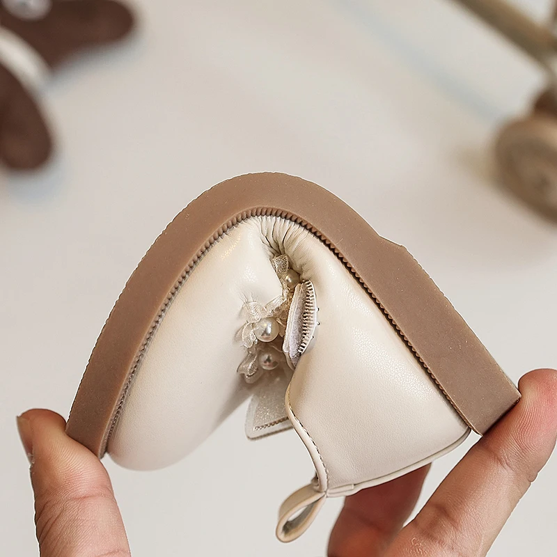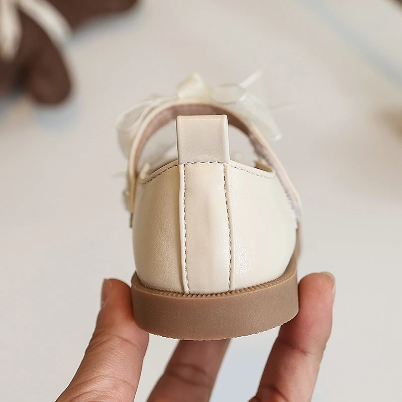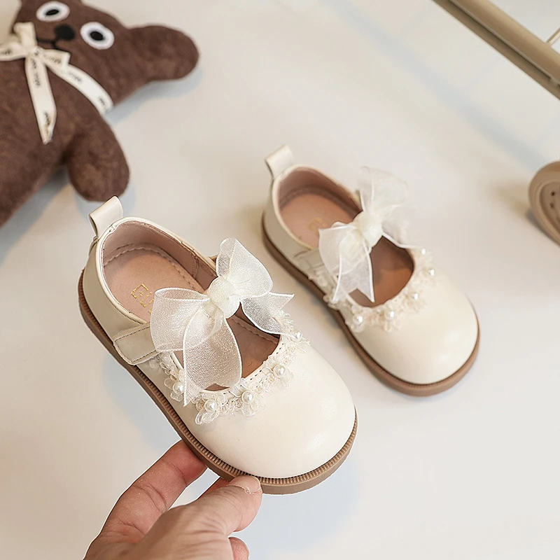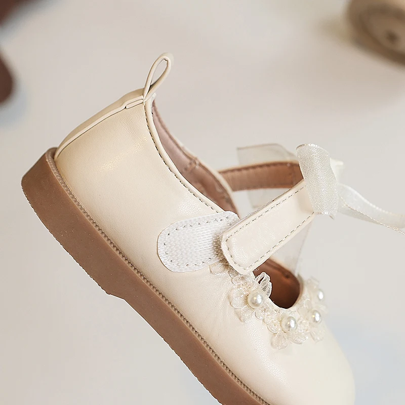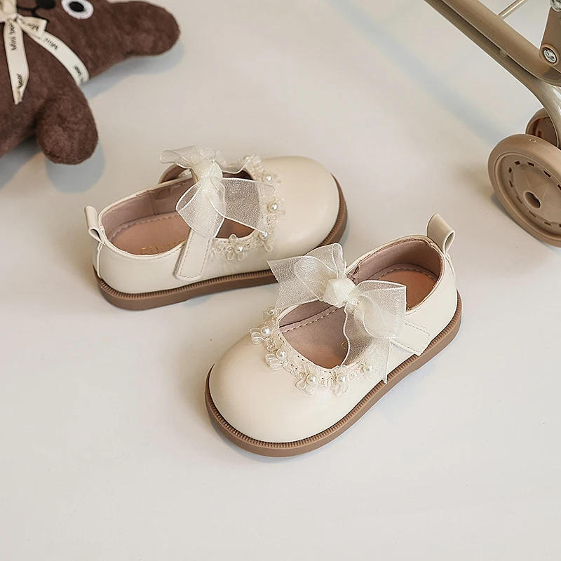 Zapatos de cuero para niñas pequeñas, zapatos planos de princesa para fiesta de boda, pajarita de encaje Mary Jane con cuentas, zapatos planos de primavera 2025 para niños, novedad