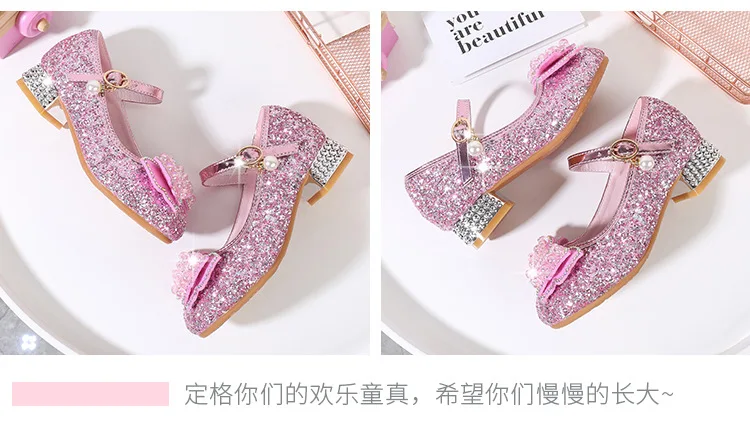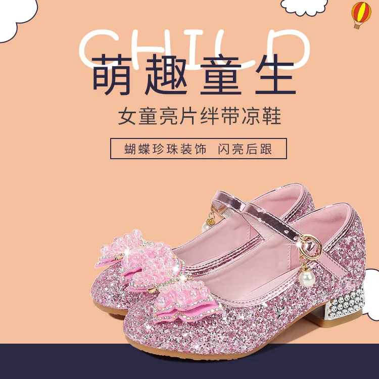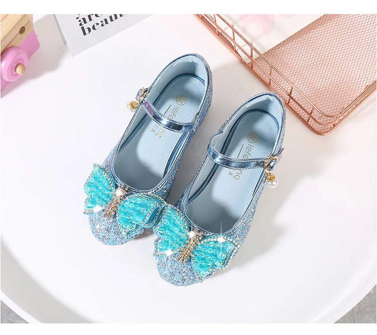 Zapatos de tacón alto con diamantes de imitación y lazo de perlas para niña, calzado de cuero para fiesta de baile, mariposa de cristal, boda, novedad de 2024