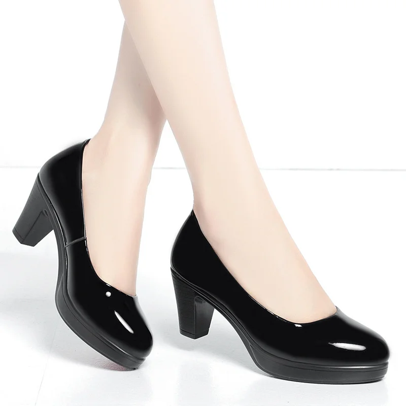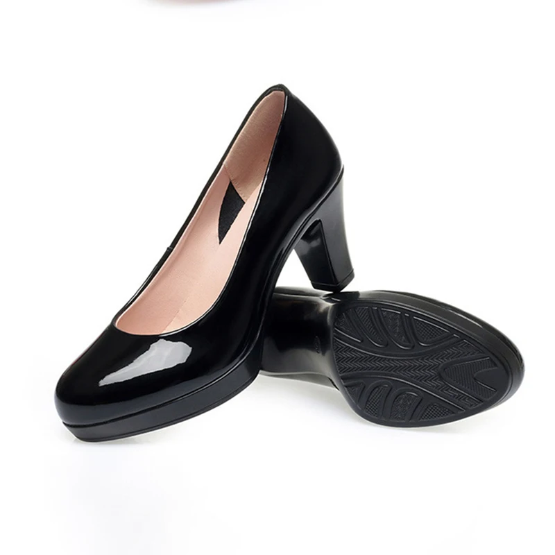 Zapatos individuales profesionales de boca poco profunda para mujer, punta redonda, suela gruesa, antideslizantes, zapatos de trabajo de tacón alto grueso negro
